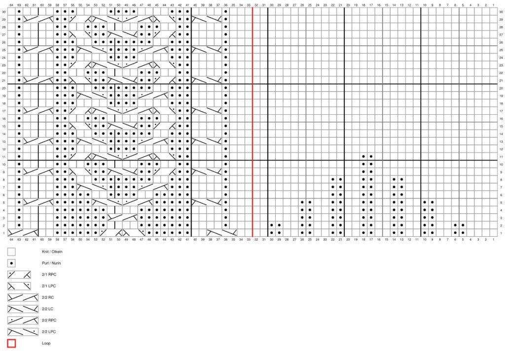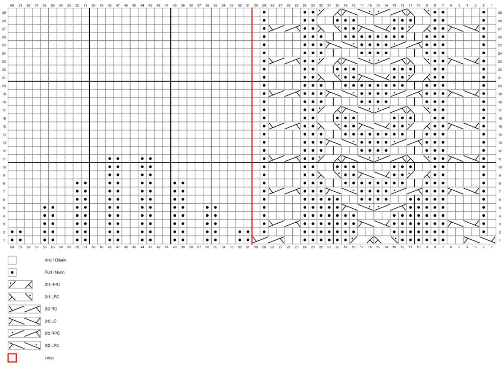 Next, work through the cuff chart. Note, there are separeted charts for right and left gloves. 60 (64) sts.