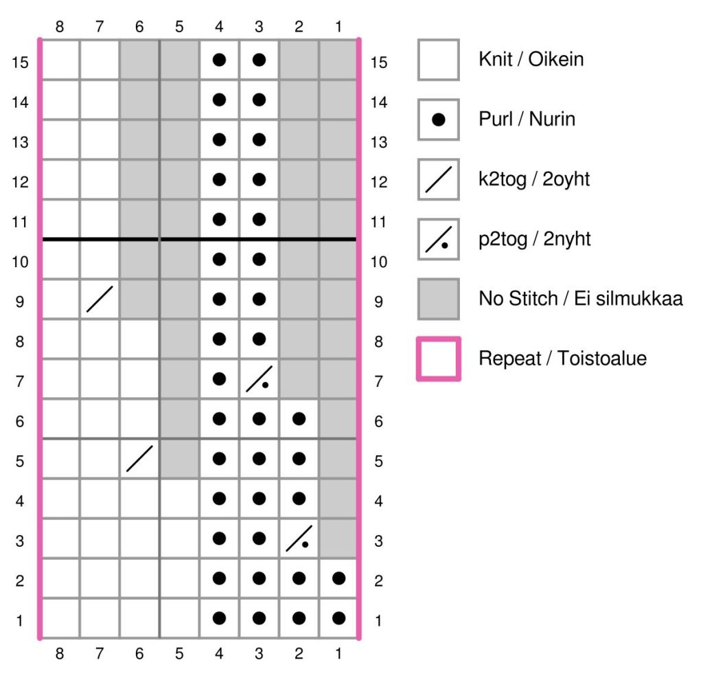 Neulo seuraavaksi rannekkeen kaavio. Huomaa, että oikealle ja vasemmalle käsineelle on omat kaavionsa. Työssä on nyt 60 (64) silmukkaa.