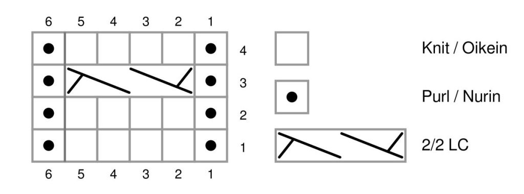 Aloita jämälangalta siirretyistä silmukoista ja neulo peukalon kaavio. Huomaa, että ensimmäisellä kerroksella kerroksen ensimmäinen silmukka siirtyy kerroksen viimeiseksi.