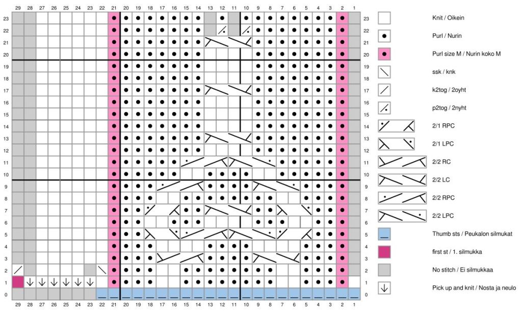 Toista kerrosta 23 niin monta kertaa, että peukalo on juuri oman sormenpään tasalla, tee kavennuskerros. Huomaa, että kaaviossa on molemmat koot, pinkillä pohjalla olevat nurjat silmukat neulotaan vain koossa M.