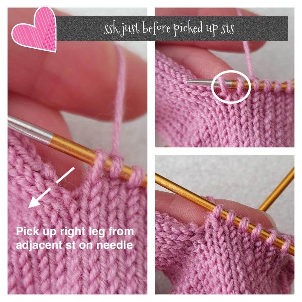 Left glove: Start from the palm side. K7 (8), cast on 3 sts, k8 (8), pick up 3 sts from the cast on edge.