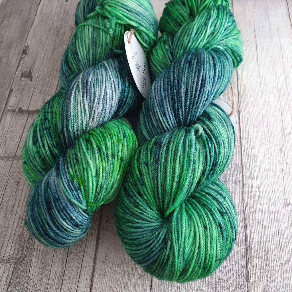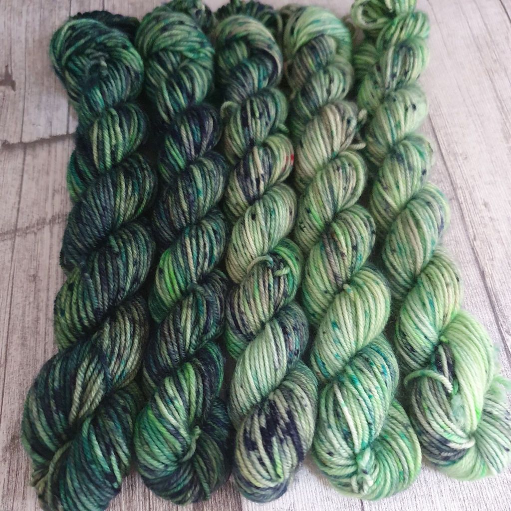Spekle, nuo ihanat väripilkut. Veden määrällä on tässä erityinen merkitys, mitä terävämpää täplää halutaan, sitä vähemmän vettä. Lanka kannattaa esiliottaa happovedessä. Jos haluaa välttää värien leviämistä viimeiseen asti, voi vyyhdin puristaa kevyesti kuivaksi ja asetella kelmun päälle. Vyyhtiin ripotellaan spekleä ja värien annetaan asettua 10-15 min ennen kääntöä. Toiselle puolelle sama käsittely. Lopuksi värit kiinnitetään joko höyryttämällä tai happovedessä keittämällä. Vähän rennompaan spekleen sopii pannuvärjäys niukassa vedessä, vyyhdit asetellaan pannuun happoveteen niin, että vesi ei peitä vyyhtiä kokonaan. Vesi kuumennetaan ja sitten vain ripottelemaan väriä.