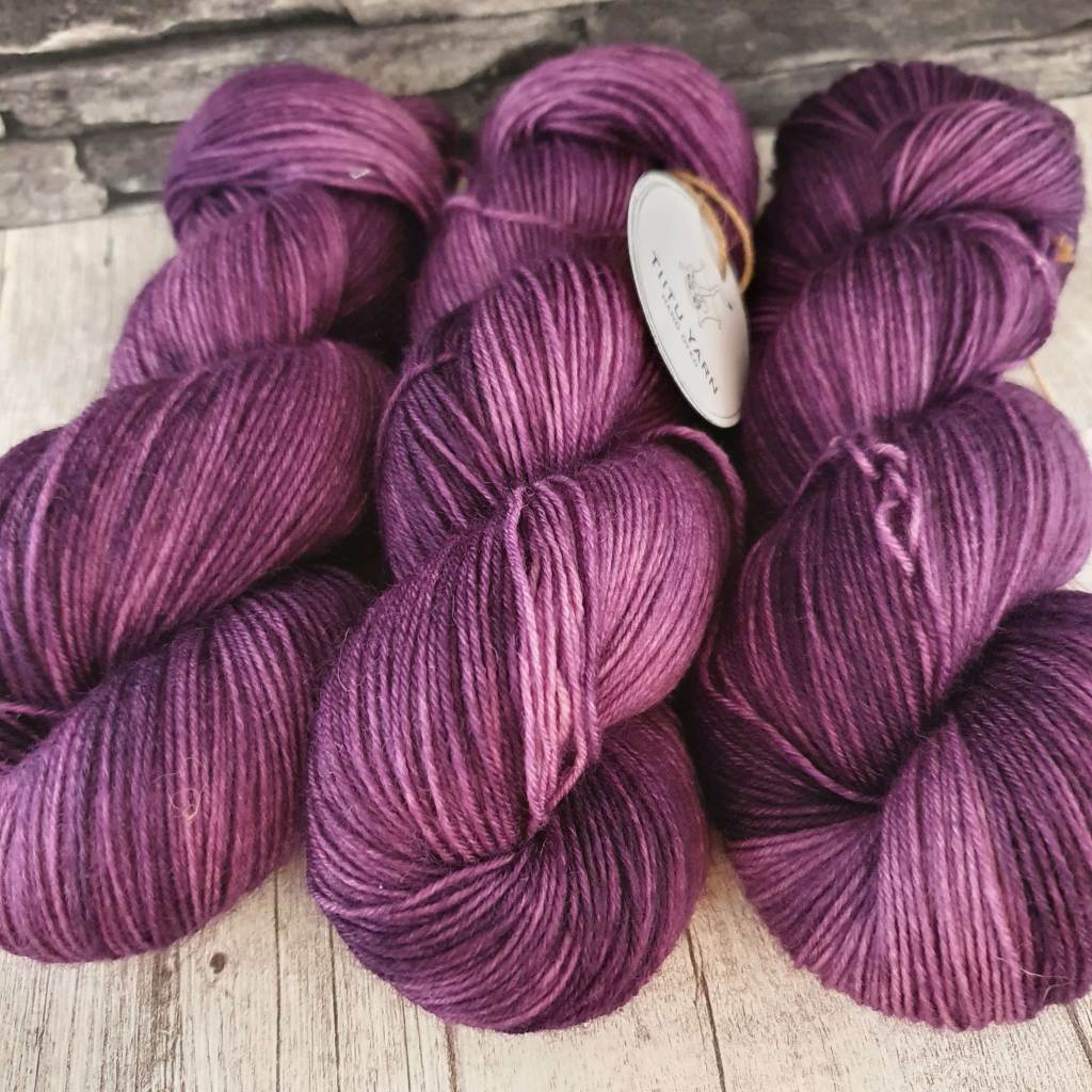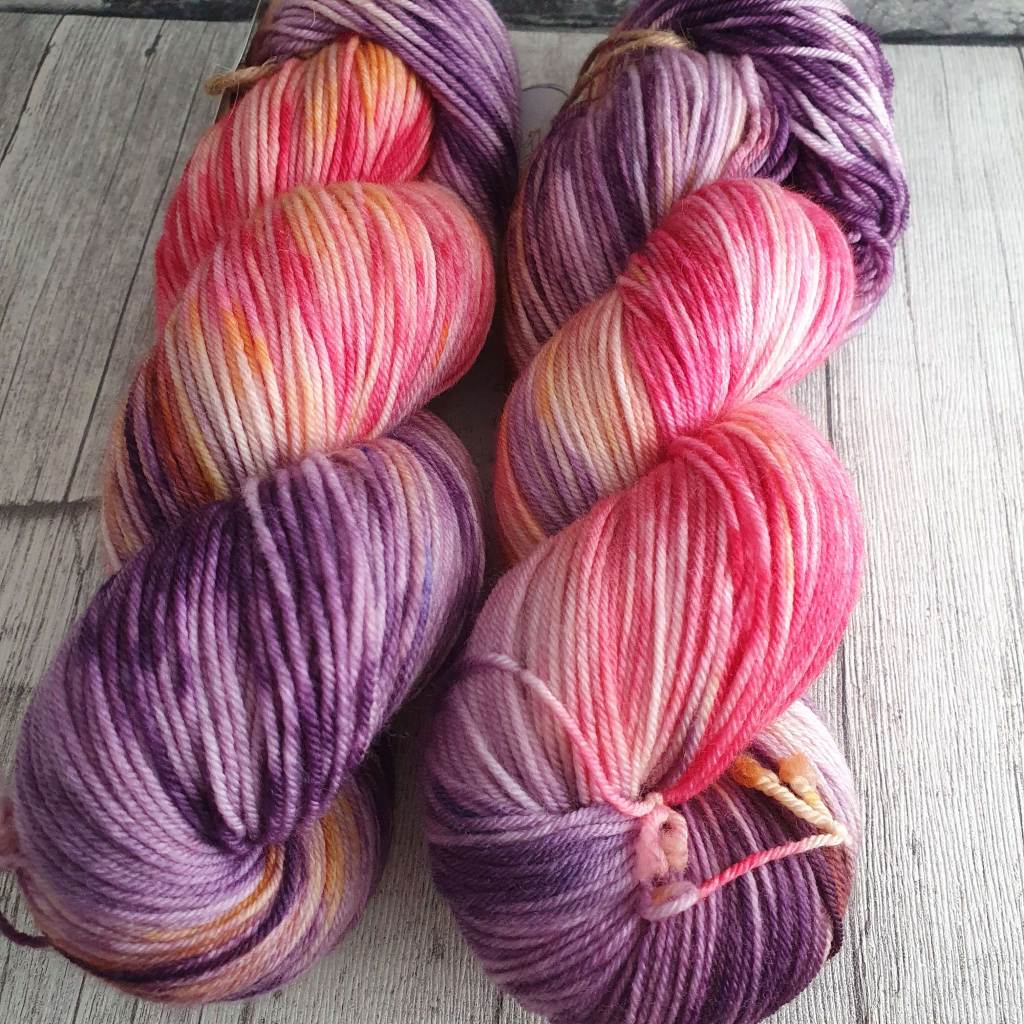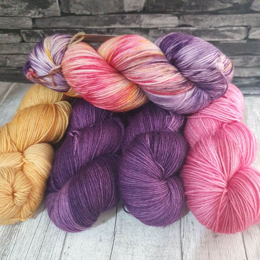 Nämä langat on värjätty vailla mielikuvaa mitä niistä tulee. Ihan vain värjäämisen ja kokeilemisen ilosta. Lilan langan pohjana on todennäköisesti BFL-villa, vähän rouheampaa, kuin yleensä värjäämäni sukkamerino. Monivärinen ja pinkki vyyhti ovat sukkamerinoa. Kaikki langat ovat fingerin vahvuutta, eli 400 m / 100 g.