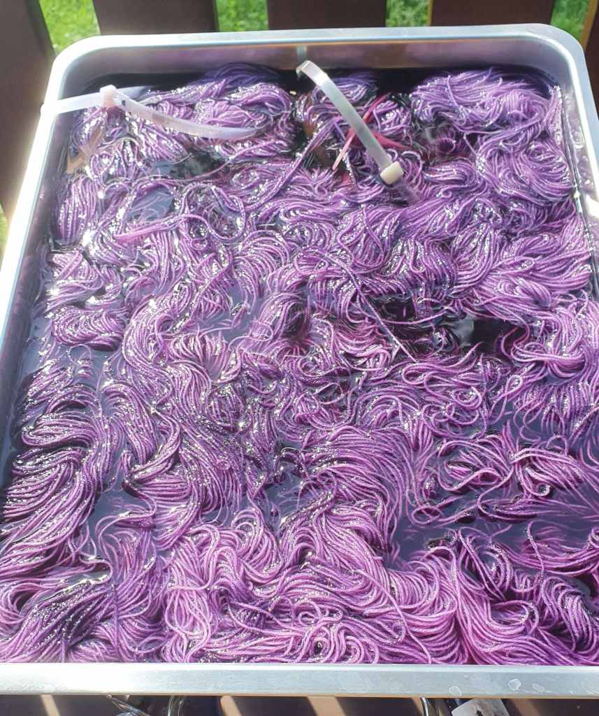 Lila lanka on värjätty pannulla vahvassa väriliemessä, pinkistä langasta ei harmillisesti ole tullut otettua kuvaa värjäysvaiheessa, mutta se on värjätty samoin kuin tämä lila lanka. Eli langat kylmään väriliemeen, kuumennus, sitruunahapon lisäys ja kiinnitys 10 min, tai kunnes vesi on kirkasta.