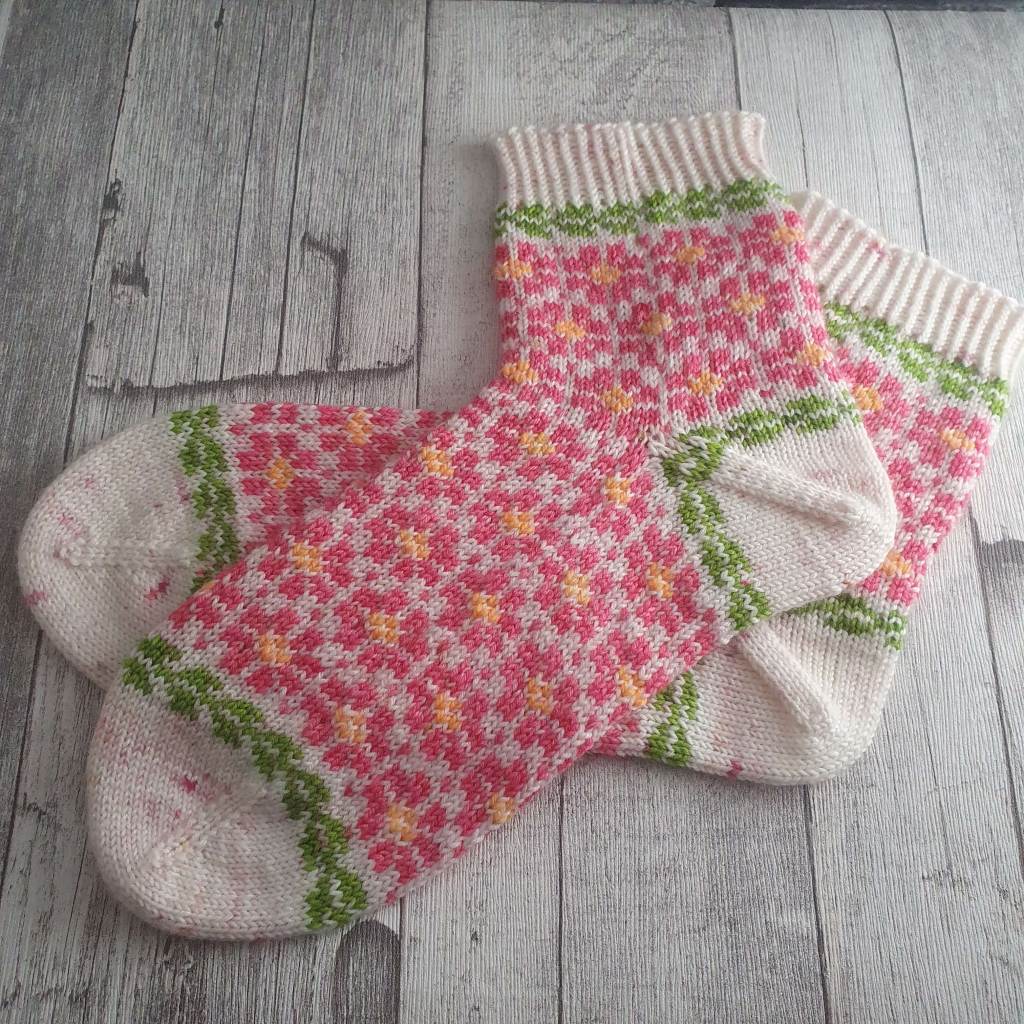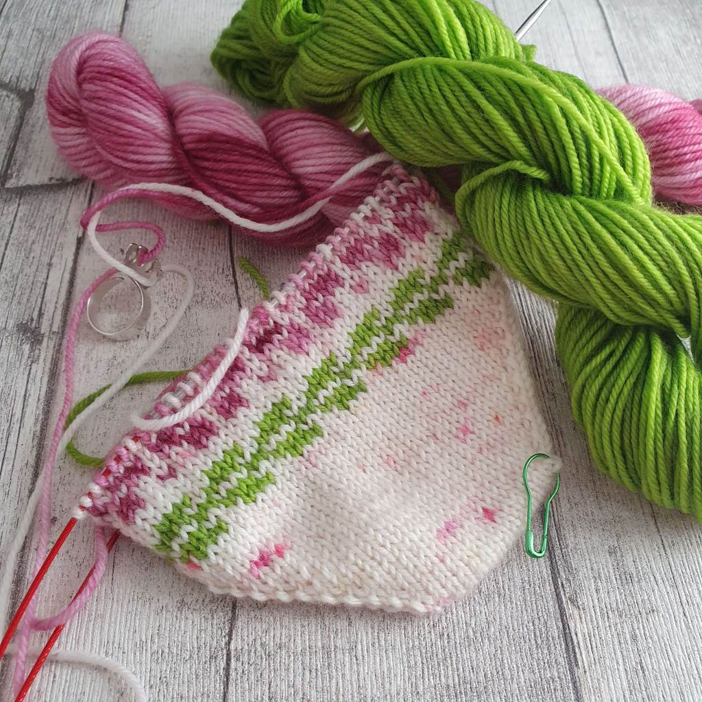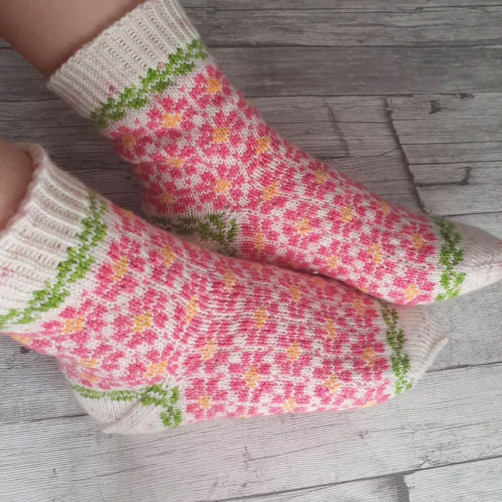 Tässä kohtaa olin tyytyväinen väreihin ja malliin. Tosin mallista poiketen kirjoin kukkien keskiosat keltaisella. Seuraava murhe oli kantapäät. Ohjeen mukaisesti sukkiin olisi tehty tiimalasikantapää, mutta en pidä sellaisen tekemisestä, enkä sen ulkonäöstä. Lisäksi halusin saman lehtikuvion kantapäähän kuin varteen ja kärkeen. Päädyin jälkikäteen tehtävään kantapäähän. Kuvio toimi kantapäässä varsin mukavasti kavennuksista huolimatta. Sukkien pohjalanka on 85 % merinovillaa ja 15 % nylonia 400 m / 100g. Aivan ihanaa lankaa kirjoneuleeseen. Käytän Lanka Piikaa tehdessäni kirjoneuletta ohuilla langoilla, sen avulla neulejäljestä tulee tasaista ja siistiä ilman hampaiden kiristelyä ja lankadominanssi säilyy koko ajan oikeana.
