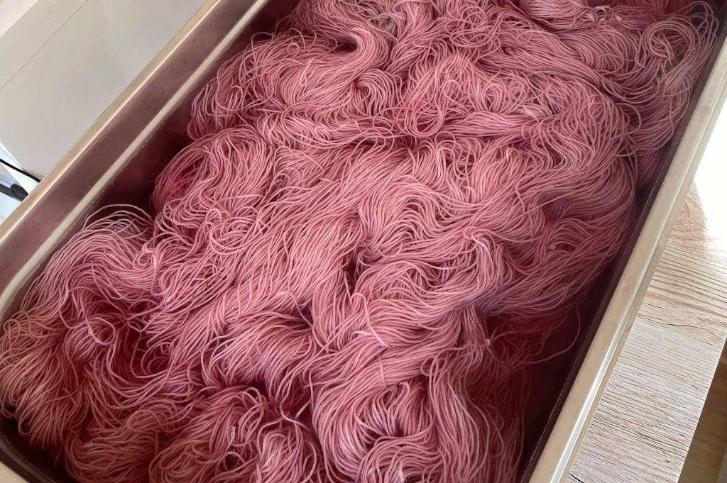Eihän siinä sitten auttanut kuin kaivaa ne oikeat 100 g vyyhdit esiin ja aloittaa homma alusta. Uusi liemi, laitoin oikein reippaasti vettä pannuun, jotta langat saavat lillua siinä mahdollisimman vapaasti ja väriin tulee vain pientä eloa. Suunnilleen saman verran väriä kuin edelliselläkin kerralla ja langat liemeen. Lisäsin sitruunahapon kummallakin kerralla vasta kuumaan liemeen, jotta väreillä on hetki aikaa tarttua rauhallisen tasaisesti ennen nopeaa kiinnittymistä happamassa ympäristössä.