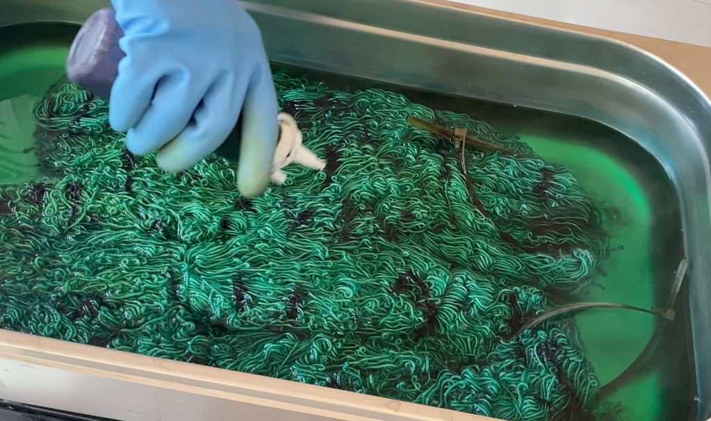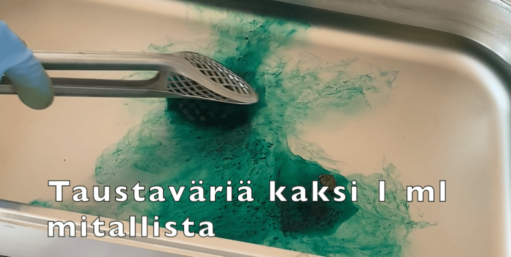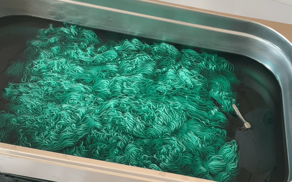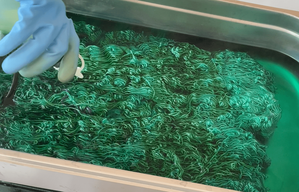 Kun pääväri oli kiinnittynyt jonkin aikaa, lisäsin pullosta keltaisempaa vihreää. Pulloon menee noin 1,5 dl vettä ja jauhetta laitoin 1 ml mitallisen. Väriliuoksina sävyjen ero on melkoinen. Puristelin värin vyyhtien toiselle puolelle reippaasti ja painelin värialueita pihdeillä, jotta väri tunkeutuisi myös alapuolelle.