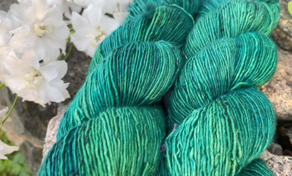Smaragdi on voimakkaan ruohonvihreä kivi. Värijauheeni oli aavistuksen liian sinertävä, mutta valitsin toiseksi vihreäksi astetta keltaisemman sävyn. Lisäksi lankaan on käytetty pieni määrä mustaa väriliuosta. Musta on lähes aina sekoiteväri. Minulla on tällä hetkellä käytössä Jacquardin Jet Black ja se on selvästi ruskeaan taittava musta. Jos sitä käyttäisi speklenä, täplät voisivat olla yllättävän värisiä. Siksi valmistin siitä liuoksen ja roiskin sitä siinä muodossa. Video värjäyksestä löytyy täältä.