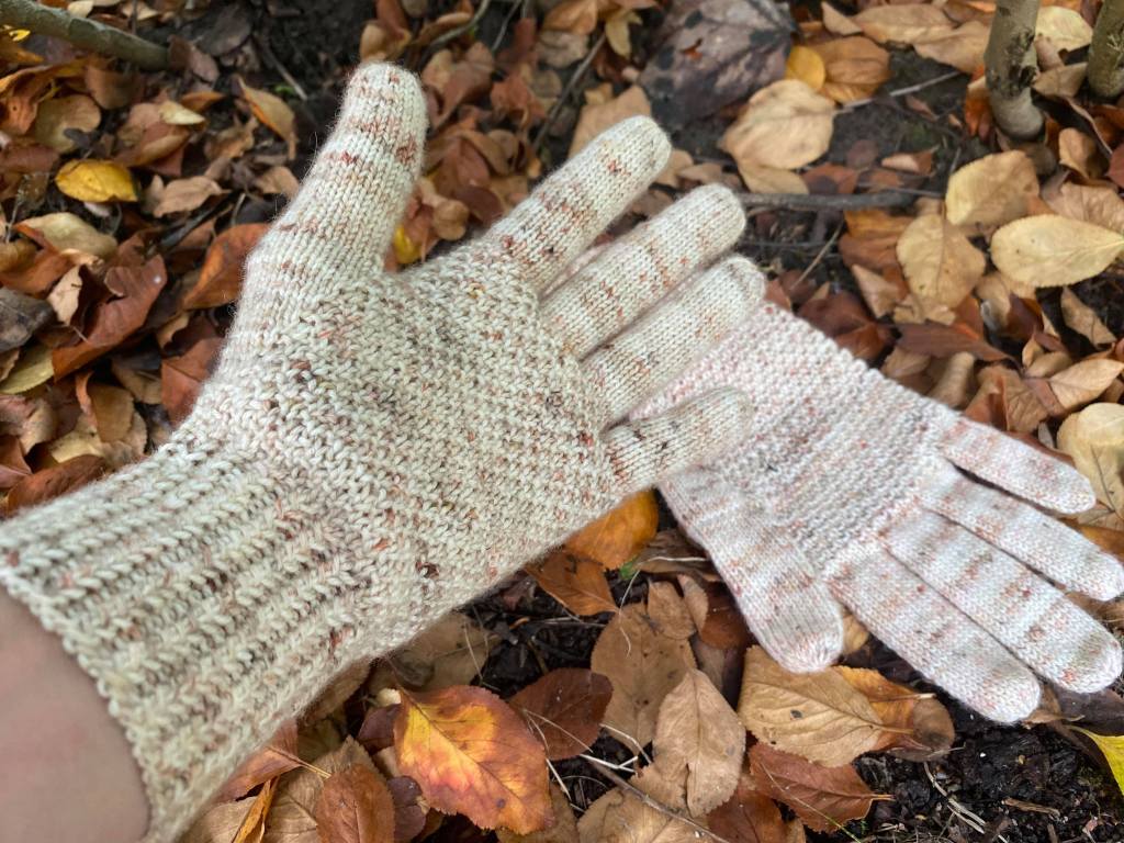 Tämä työ on jälleen hyvä muistutus, kuinka hillitystä langasta hillityllä kuviolla voi tulla todella eloisa. Valitsemani resori näyttää hauskalta ja vähän nyörimäiseltä, mutta oli helppo ja nopea tehdä. Resori on 2o, 1 n joustinta, jossa oikeat silmukat on neulottu joka toisella kerroksella niin, että ensimmäinen silmukka nostetaan, toiseen neulotaan 2s ja vedetään nostettu niiden yli. Kämmenosaan valitsin hyvin simppelin pintaneuleen, jonka nimikin sopii työhön erinomaisesti ”sand stitch”. Ajattelin ensin, että teen käsineet miesten koossa, mutta tulin lopulta siihen tulokseen, ettei perheen miehet tule ikinä käyttämään näin vaaleita käsineitä. Tulossa on siis totuttuun tapaan naisten S kokoa.