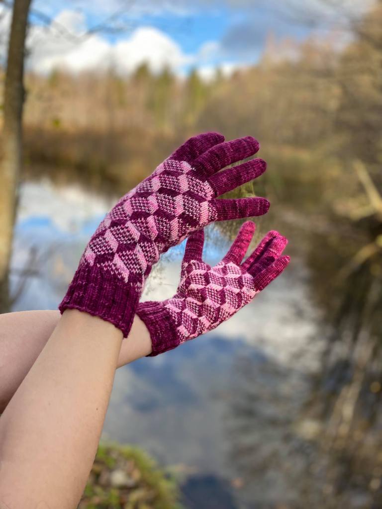 Tämän parin ajatus oli heti selvä. Kirjoneuletta, joka luo illuusion kolmiulotteisuudesta. Värien välillä pitää olla riittävästi kontrastia, mutta ei niin, että neuloessa saa migreenin. Päätin tehdä nämä jämäkeristä. Valitsin pääväriksi Leinikkisetin taustavärin, tumman viininpunaisen. Kontrastiväriä arvoin pidempään, mutta päätin kokeilla Winter Lights shawlin yhtä kontrastivärijämää. Värit toimivat kivasti yhteen, valöörieroa on riittävästi, mutta ei niin, että pinta aiheuttaisi tehdessä pahoinvointia.