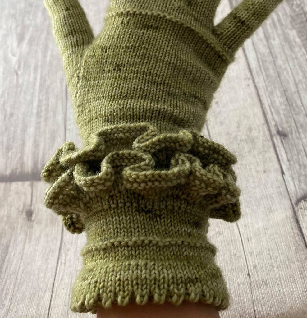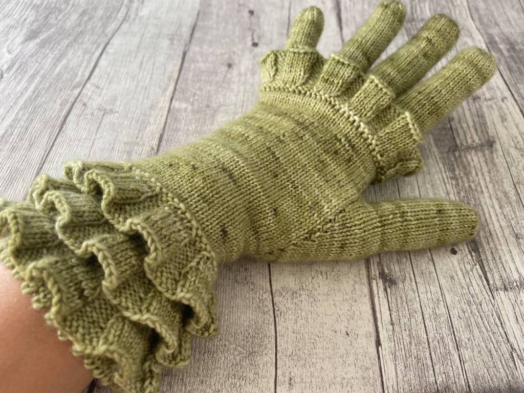 Kun toisessa käsineessä oli kolme röyhelöä neulottuna, huomasin, että röyhelöt ovat kivemmat, jos ne avautuvat käsivarteen päin. Lisäksi röyhelöt olivat liian pitsimäiset. Yllä olevan yritelmän nurja puoli oli jollain tapaa kivempi, joten muokkasin jälleen röyhelöä eleettömämpään suuntaan. Otin toisen käsineen työn alle ja neuloin röyhelöviritelmä numero kolmosen siihen. Nyt olin tyytyväinen. Röyhelössä ei ollut mitään liikaa.