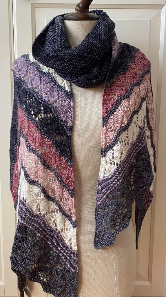 Ostin tämän ohjeen heti sen ilmestyttyä, mutta en löytänyt silloin sopivia lankoja ja huivi unohtui muutamaksi vuodeksi. Äskettäin minulla tuli äkillinen tarve kaulaliinalle ja muistin tämän ohjeen. Tällä kertaa langoissa oli valinnan varaa. Pidän ohjeen huivin väreistä, joten lähdin samankaltaisella paletilla liikkeelle. Pääväreinä on lähes musta ja tumma harmaa, musta on jämää R-kirjaimesta, harmaata oli koko 100 g vyyhti. Raitaväreiksi valitsin vaaleanpunaista, valkoista ja lilaa. Valkoiset olivat jämiä aiemmista sormikkaista, vaaleanpunainen on samaa lankaa, mistä tein lempivillatakin ja Enkeli-sormikkaat, Lila on V-kirjaimen jämää. Tumma roosa on hutivärjäyserää lempivillatakista.