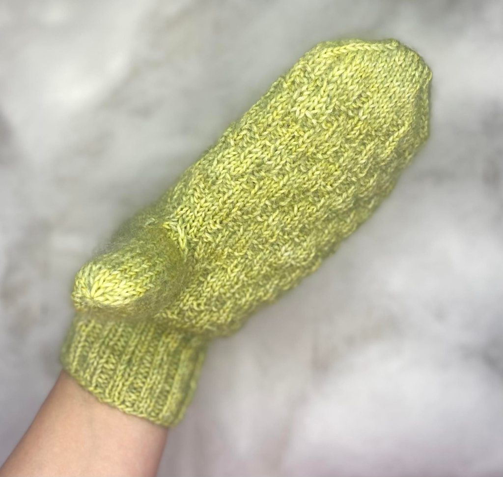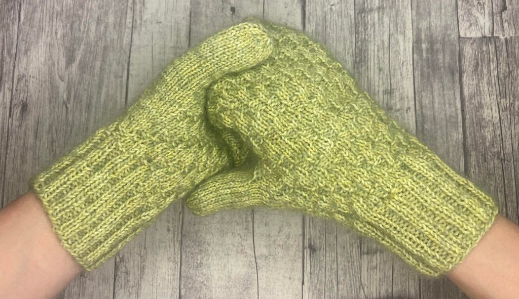 Päättele langanpäät. Kastele ja muotoile lapaset tarvittaessa.