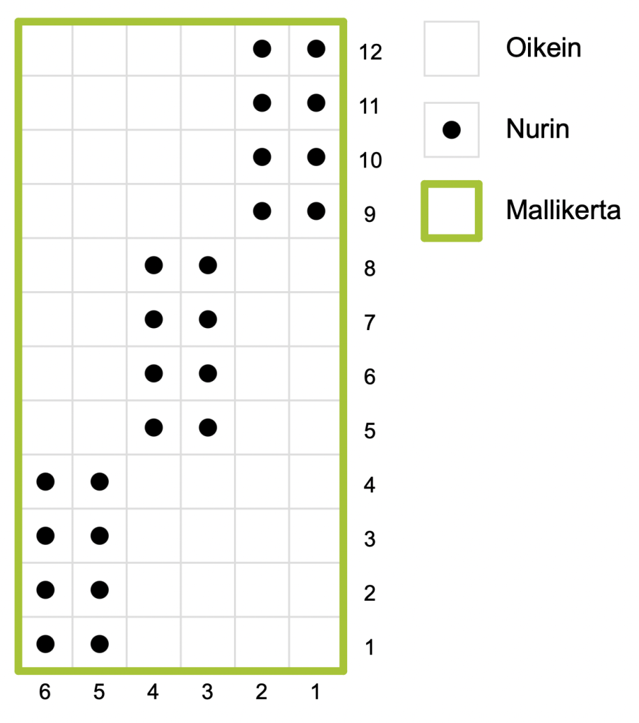 1 krs. Neulo mallineuletta merkille, sm, knk, 3o, 2oyht, neulo mallineuletta kerros loppuun.