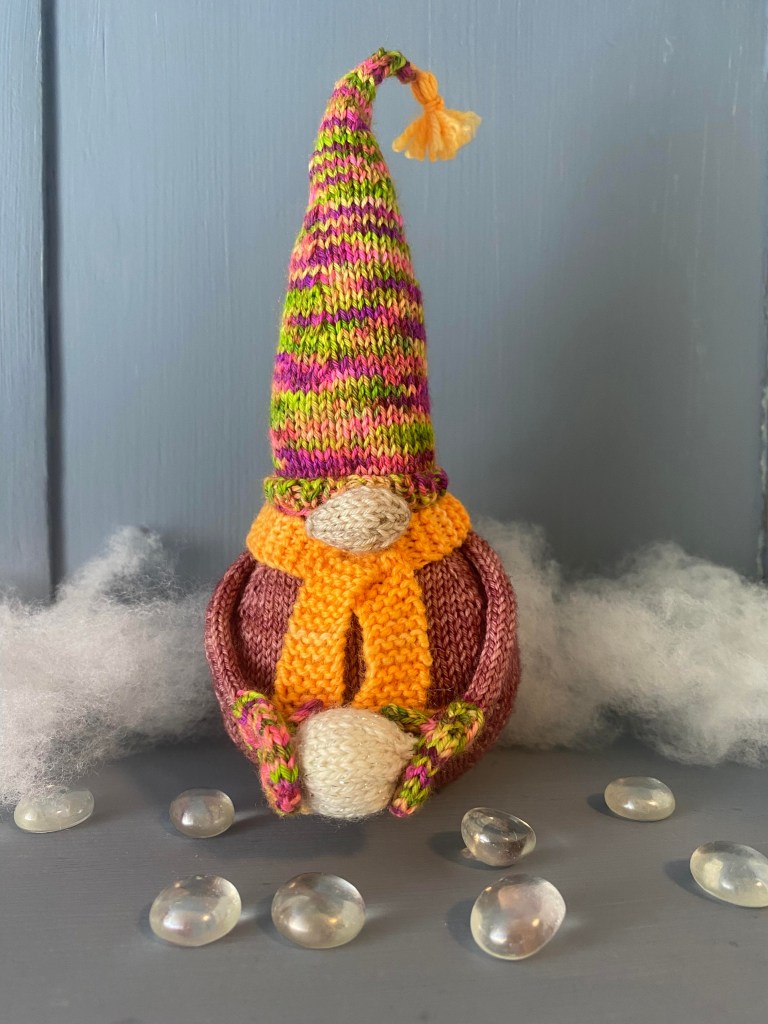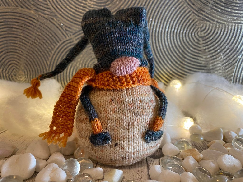 Ensimmäiseksi neuloin ”Oh, Gnome, You Didn’t” tontun. Malli näyttää suht helpolta, joten sillä on hyvä harjoitella tonttujen perustekniikat ja tutustua suunnittelijan tapaan kirjoittaa ohjeet.