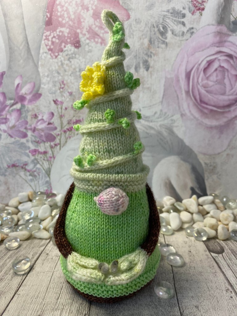 Huhtikuun tonttu sai keväisen värityksen vallitsevasta säätilasta huolimatta. Tämä tonttu on neulottu All Work, Gnome Play ohjeella. Värimaailma oli teeman mukaisesti hempeää vaaleanvihreää, koristeina on pieniä lehtisilmuja ja voikukka.