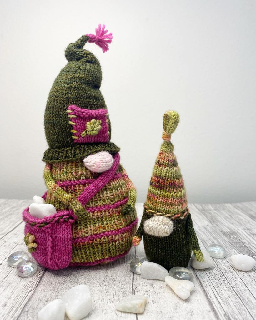 Maaliskuun tonttupari on Leave Gnome Stone Unturned ohjeella tehty. Värit ovat maanläheistä vihreää ja kirkasta magentaa. Pikkutontun nenä on niin iso, että raukka pysyy hädin tuskin pystyssä.