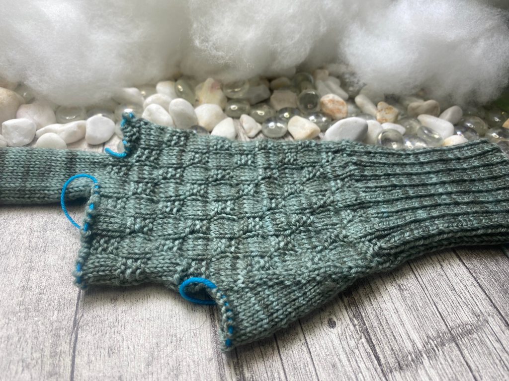 Pintaneuleeksi valikoin ruudullisen kuvion. Kuviossa on 8 silmukan levyinen mallikerta, mutta sen voi katkaista myös puolivälissä, joten se oli helppo sijoittaa käsineisiin. Korkeutta mallineuleella on 12 kerrosta, mutta tässäkin suunnassa kuvion voi lopettaa kesken puolivälissä.