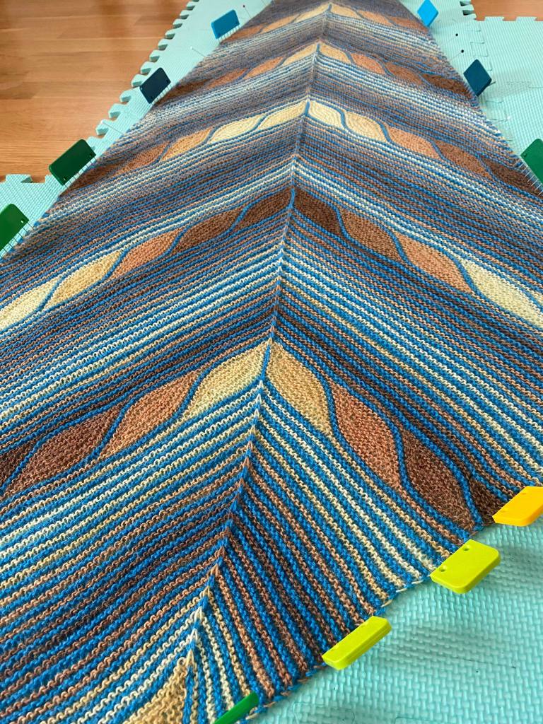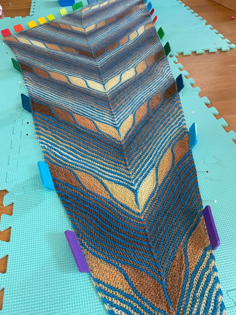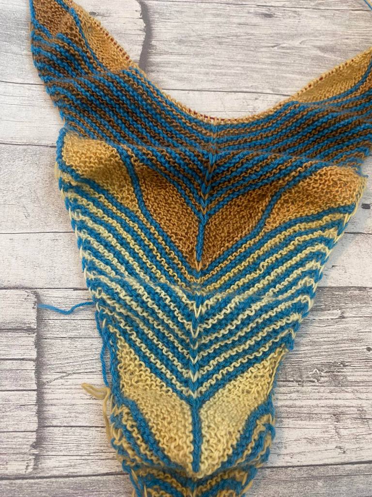 Huivini vaati kevyen muotoilun ja pingotuksen. Alkuosan pussitus katosi muotoilussa täysin, vaikka huivin alku muistutti melkein papukaijan nokkaa. Lopullinen muoto jonkinlainen pitkä kolmio. Keltaista lankaa meni vajaat kaksi kerää ja turkoosia tasan 2 kerää. Olisin tarvinnut turkoosia muutaman metrin enemmän, mutta päädyin fiksaamaan huivin viimeisiä kerroksia, niin että lanka riitti juuri ja juuri huiviin, kun jätin muutaman kerroksen tekemättä.
