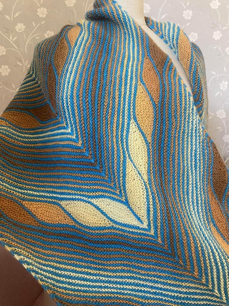 Huivin lehtimäiset kuviot on tehty lyhennetyillä kerroksilla. Kuvion oppi nopeasti ulkoa ja koska huivi on lähinnä oikeaa, oli sitä mukava neuloa television äärellä.