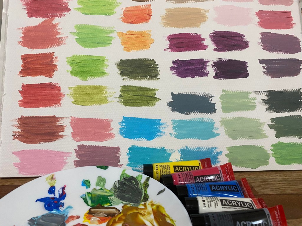 Kurssi alkaa inspiraatio-osalla, jossa tehdään maalausharjoitus ja tutkitaan värejä. Koska väriopin kurssi on tullut käytyä jo nuorena artesaaniopintojen yhteydessä, ei kurssi tuonut siltä osin juurikaan uutta tietoa. Tein silti maalausharjoitteet akryyliväreillä, kertaus ei ole koskaan pahasta. Oli mukavaa Töherrellä maalien kanssa pitkästä aikaa, 5 sävyllä saa melkoisen värikirjon aikaiseksi.