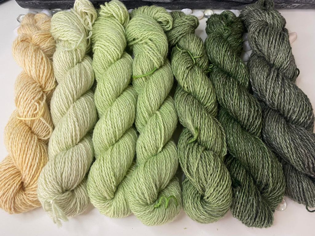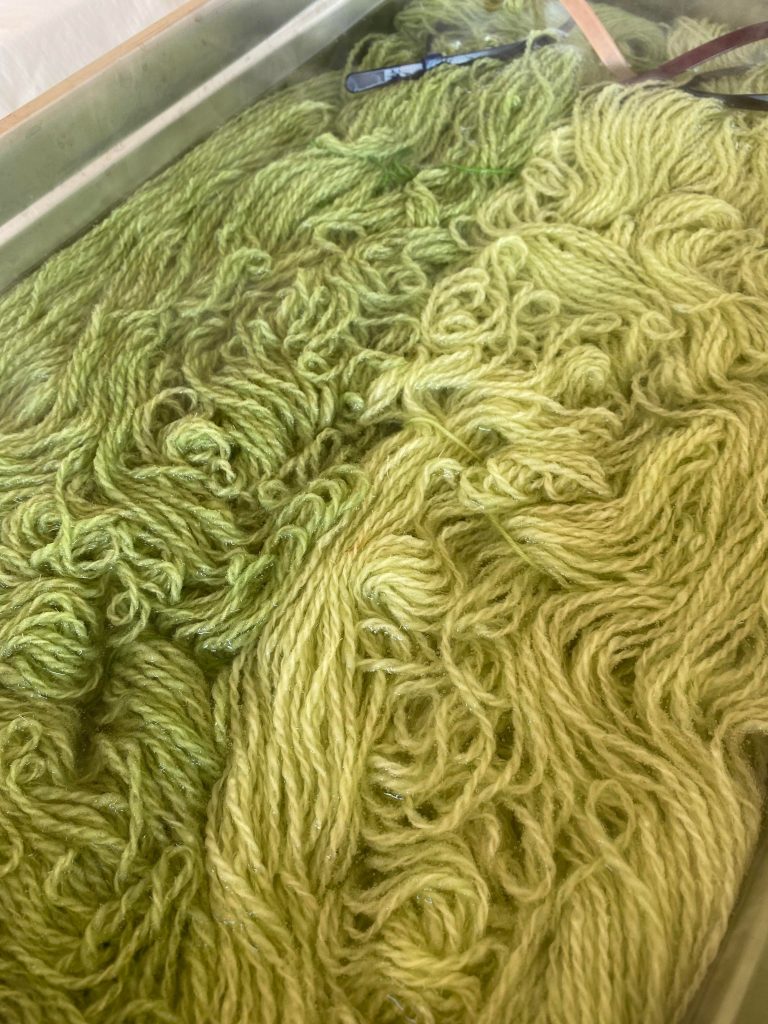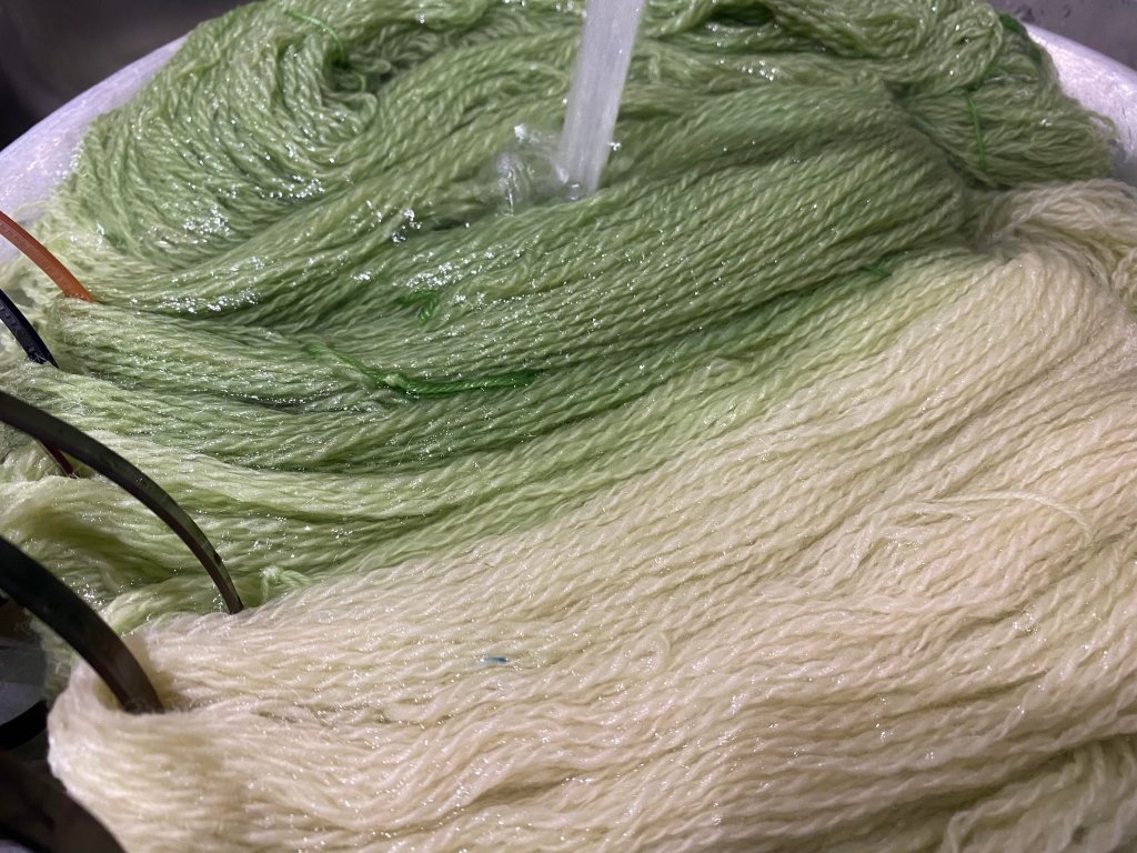 Yllä vihreiden lankojen värjäystä. Halusin keväisen raikasta vaaleaa vihreää ja tummempaa, synkempää vihreää taustaksi. Aloitin vaaleilla sävyillä. Sekoitin isomman jauhe-erän eri sävyjä keskenään ja testasin minivyyhdillä liuoksen sävyn. Pienen hienosäädön jälkeen uskalsin siirtyä varsinaisiin vyyhteihin. Koska lanka on villa, alpakka ja viskoosisekoitetta, ottaa se väriä ihan omalla tavalla. Sävyistä tulee mielenkiintoisen kevyitä ja tummiin väreihin joutuu laittamaan ehkä jopa tuplasti värijauhetta verrattuna merinoon. Oikeanpuoleisessa kuvassa näkyy, kuinka säädän vihreää mustalla tummempaan suuntaan. Kaikkien lankojen vihreä pohjaväri on samasta seoksesta, määrä on vain eri.