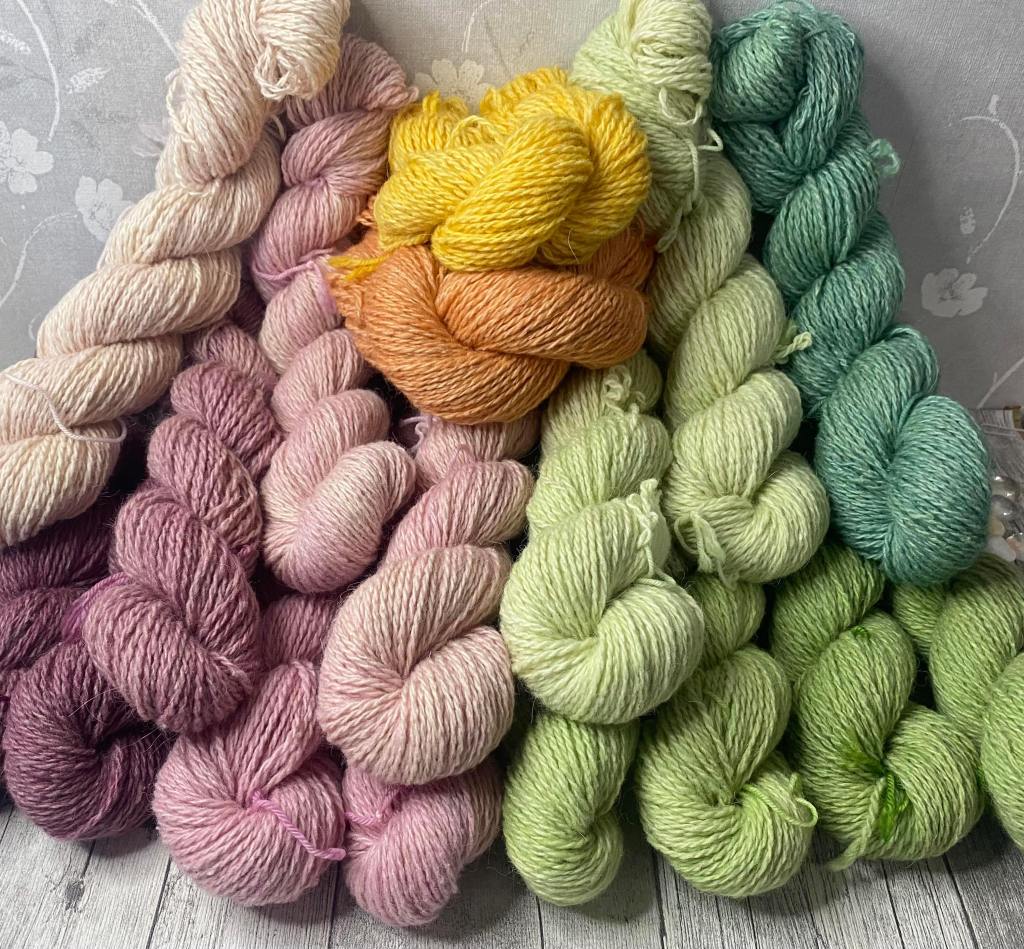 Kukkiin tulee punaisia sävyjä, punaisten lisäksi tein tehosteväreiksi keltaisen ja oranssin. Sekoitin yhden tomuisen vanhan roosan sävyn ja päätin mennä sillä. Vaaleita sävyjä oli hieman haastavaa saada aikaan ja väriä meinasi mennä aina liikaa liemeen. Lehtien sävyistä värjättynä on vain turkoosi, ja ehkä vaalean keltainen, vielä yksi väri pitäisi keksiä. Onneksi sitä ei tarvita peiton ensimmäisessä vaiheessa, joten voin jäädä pohtimaan asiaa ja pyörittelemään lisää vyyhtejä värjäyskuntoon.