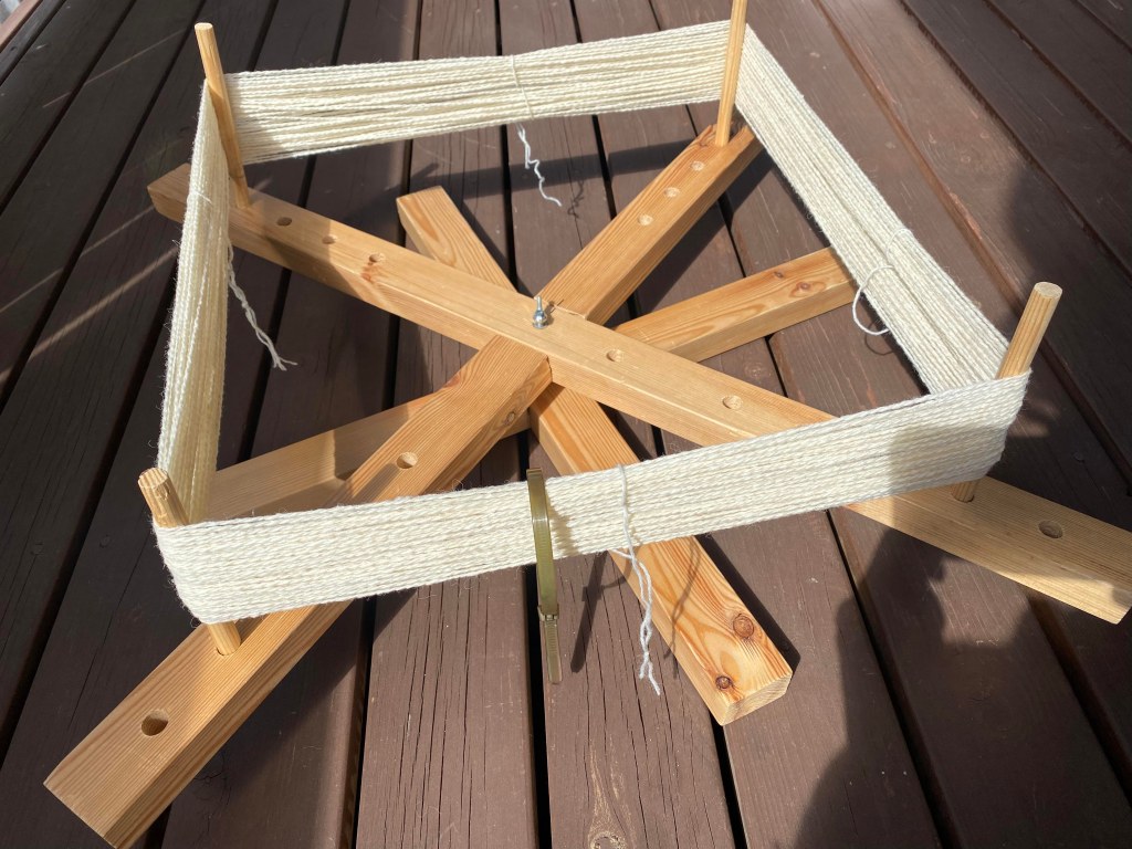 Peittoon menee noin 45 kerää lankaa, yhdessä kerässä on 130 m lankaa. Vyyhdettävää olisi noin 6 kilometriä. Puolisoni on tehnyt minulle vyyhteämiseen sopivan vyyhdinpuun. Rullaluistimen laakerilla toimivalla härpäkkeellä on kevyt pyöritellä lanka vyyhdeille. Vyyhteihin tulee 4 pasmalankaa, yksi jokaiselle sivulle ja uudelleensuljettava nippuside, näin lanka ei sotkeudu värjätessä. Sitten vyyhti on valmis värjäykseen.