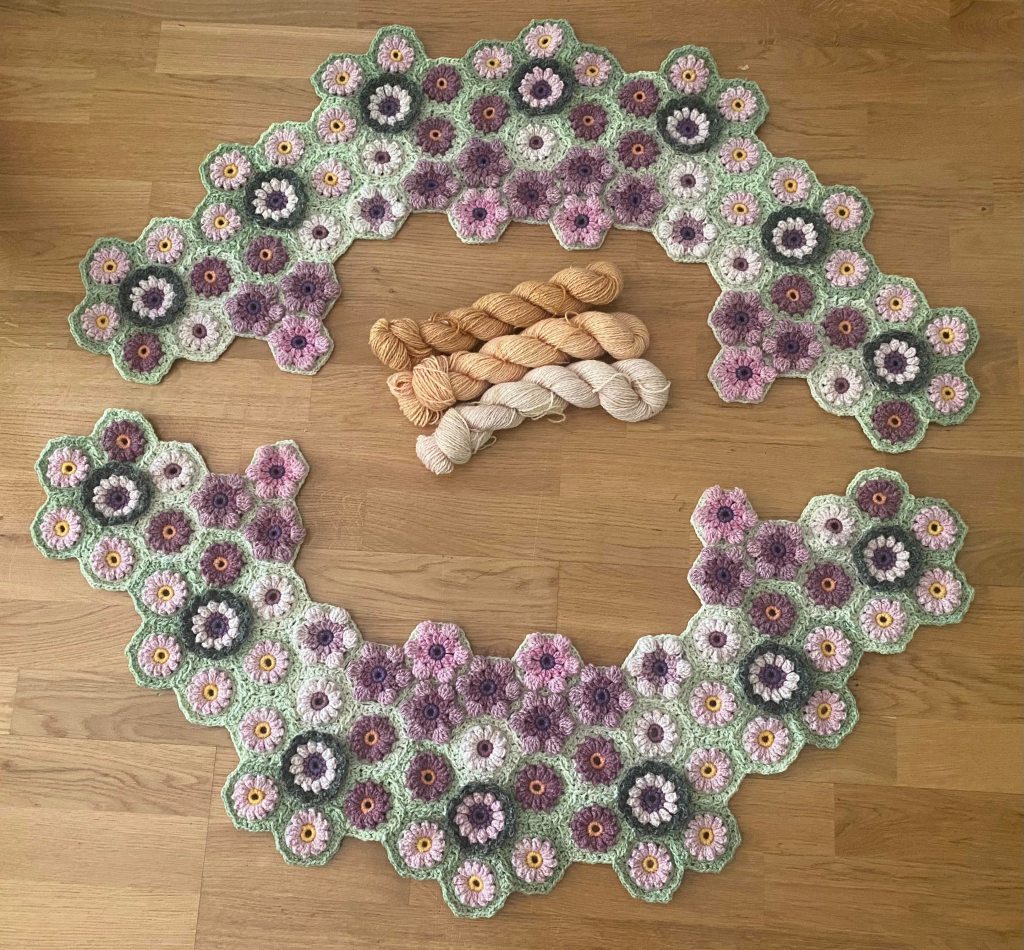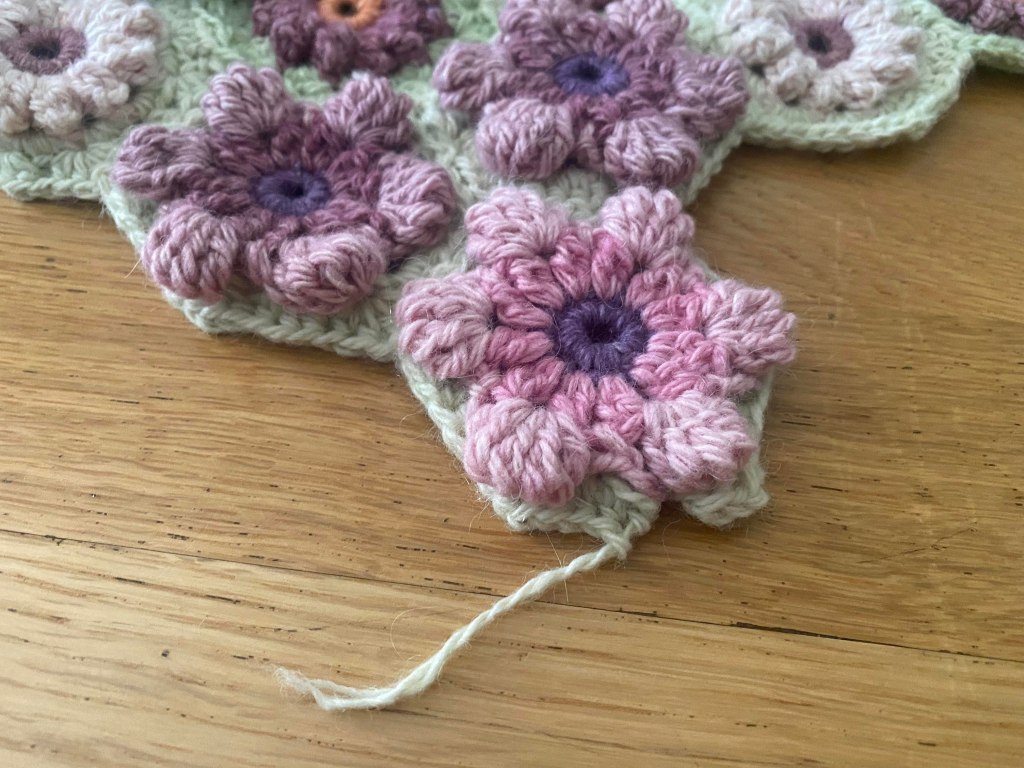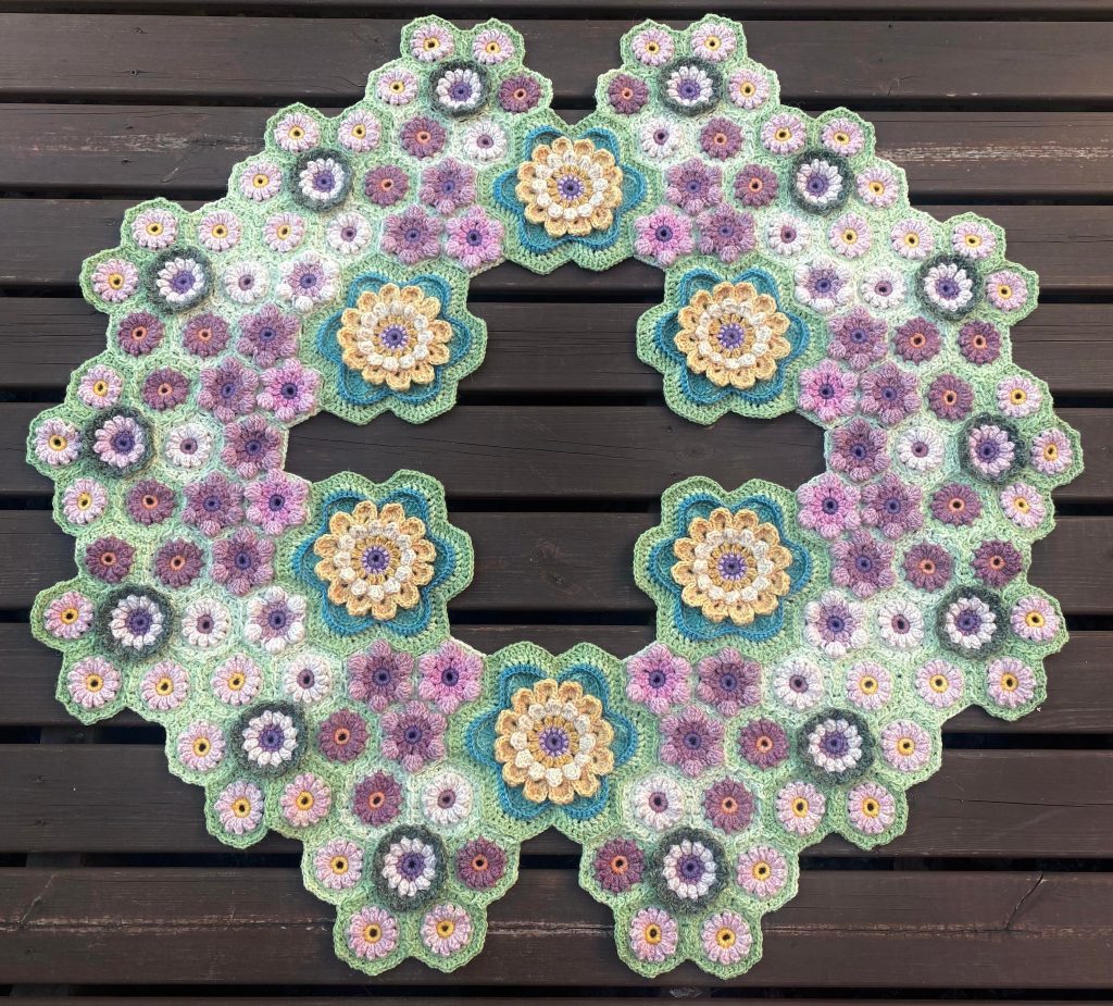 Isojen kukkien kiinnitys oli haastavaa, koska menin muokkaamaan kukkaa, jouduin laskemaan ja kokeilemaan kiinnityskerroksen uusiksi. Terälehtien välissä olevat sisäkulmat olivat haastavat saada kiinnityksessä siistiksi. Jos peitto olisi aloitettu näistä kukista, olisi kiinnitys ollut paljon helpompi. Toisin sanoen, jos joskus teen tämän projektin uudestaan, aloitan näistä isoista kukista ja hoidan kiinnittämisen pikkukukkien viimeisellä kerroksella.