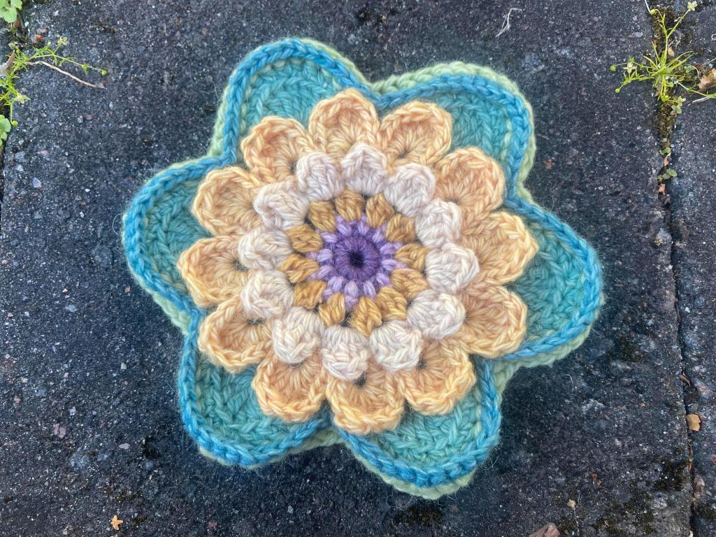 Isojen kukkien ohje oli ensimmäinen, jossa en enää käyttänyt videota, sillä en jaksanut katsoa niin pitkiä ohjeistuksia. Siirryin käyttämään kirjoitettuja ohjeita, joissa on myös kaavakuvat mukana. Koska suunnittelija Sue Maton on britti, ohjeen termistö on luonnollisesti UK-termein. Onneksi nämäkin termit ovat tuttuja, joten täytyy vain keskittyä vähän enemmän ohjetta lukiessa. Tämän kukan nimi on 3D, joten päätin muutella siitä vähän enemmän kolmiulotteisen, kuin mitä ohjeessa oli. Keskiosaan laitoin samaa tummaa lilaa kuin edeltäviin pikkukukkiin, mutta vaalea lila, keltaiset ja turkoosit ovat kokonaan uusia sävyjä, toivottavasti kukat asettuvat kuitenkin kokonaisuuten. Vaaleampi turkoosi, josta kukan ympärillä olevat lehdet ovat loppui lähes kokonaan, pienestä loppunöttösestä saa ehkä muutaman keskiosan jonnekin, niin että väriä on muuallakin peitossa.