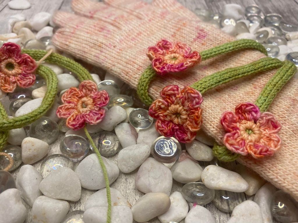 Koristeiksi tulee neulottua putkiloa, eli icordia ja virkattuja kukkia.