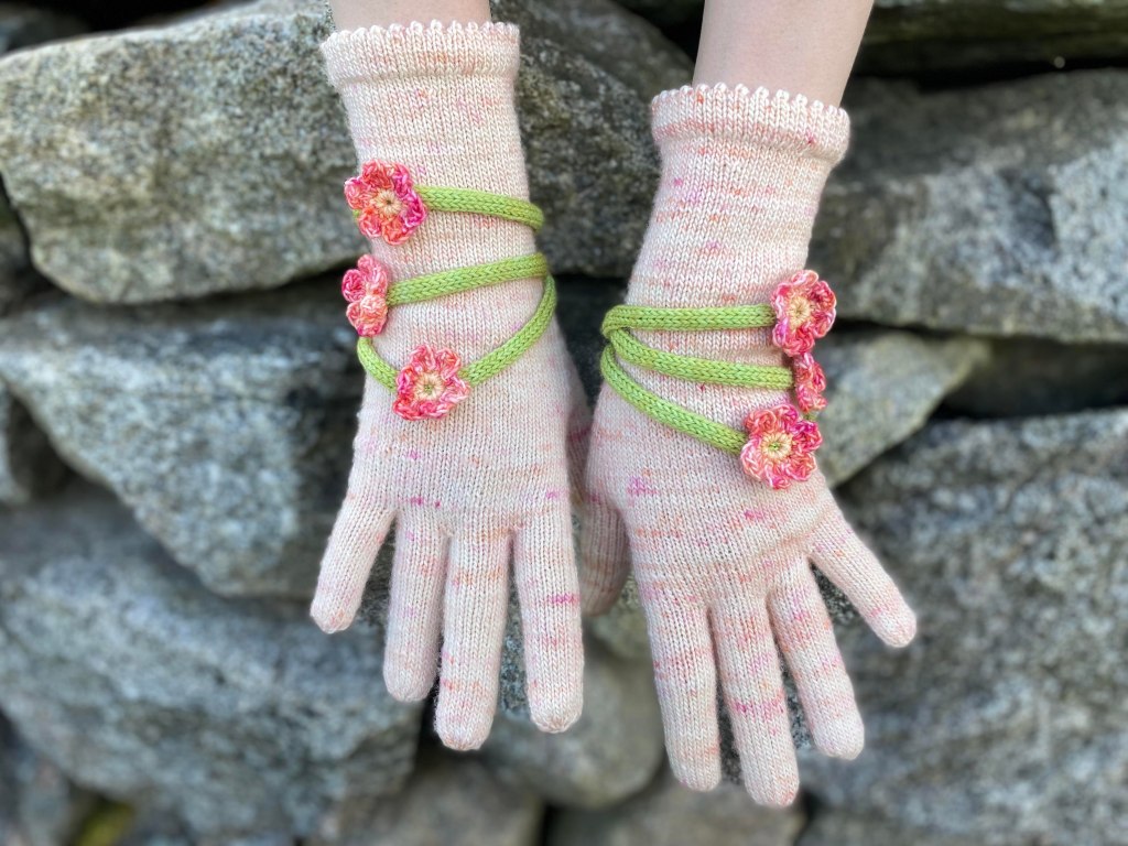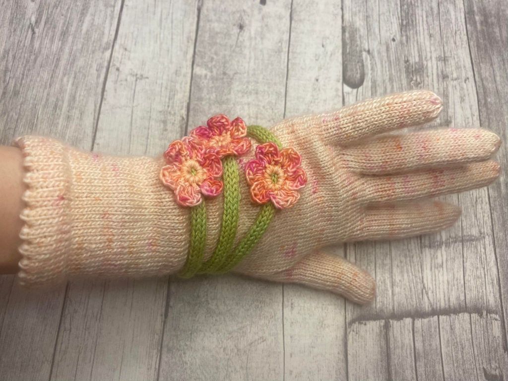 Näitä sormikkaita on melkein mahdotonta kuvata yksinään edustavasta kuvakulmasta. Koristeet asettuvat käsineisiin niin, että ne näyttävät katsojan suunnasta kauneimmilta.