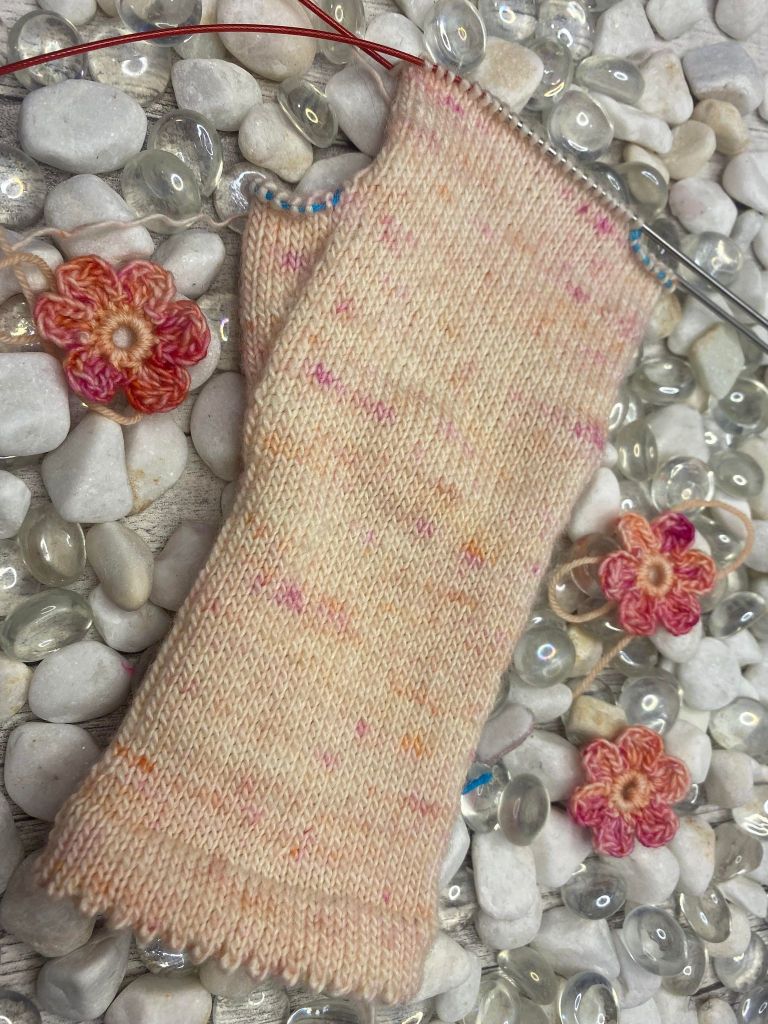 Käsineiseen valitsin herkän vaalean 366 m / 100 sinkkumerinon. Lanka on spekletty vaaleanpunaisella ja oranssilla äärimmäisen kevyesti. Cocktailit on neulottu tästä samaisesta langasta.