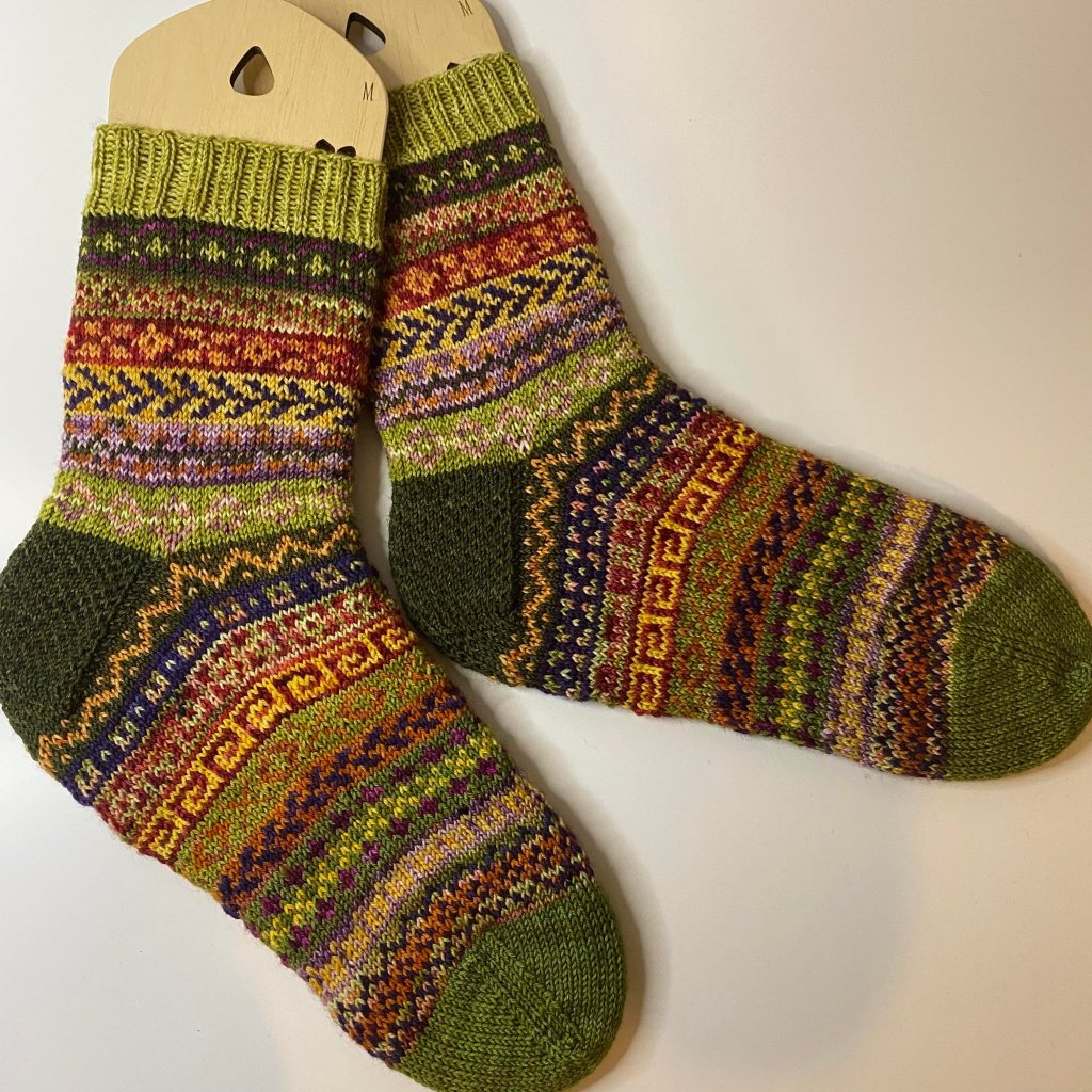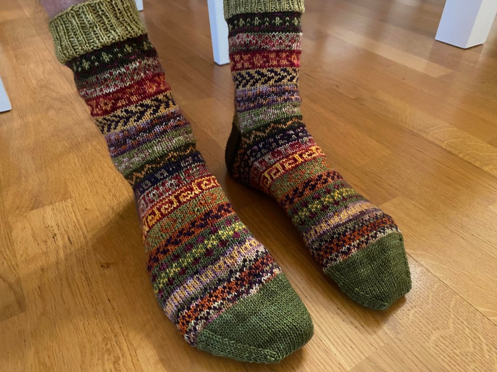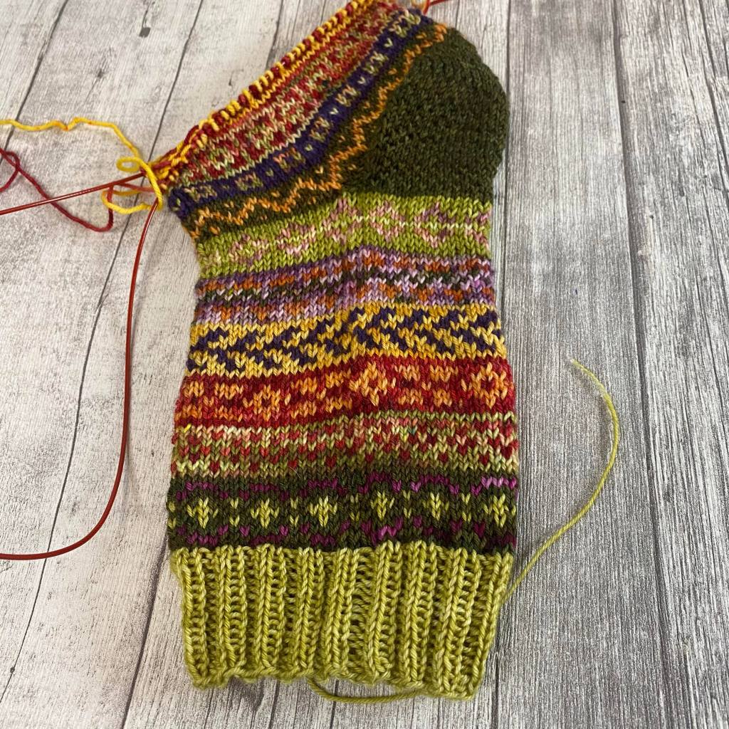 Valikoin ison kasan erilaisia vihreän, punaisen ja oranssin sävyisiä lankoja ja aloin neulomaan. Resoria varten loin 72 silmukkaa, sillä katsoin, että kuviot olivat 12, 6 tai 4 jaollisia. Muutaman päivän vihjeen jälkeen alku näytti todella lupaavalle ja kokokin oli passeli pohkeeni ympärille. Puoliso oli kuitenkin vailla villasukkia ja värit olivat hyvin sukupuolineutraalit, joten pyysin häntä kokeilemaan onko silmukkamäärä sopiva hänen jalkaansa.