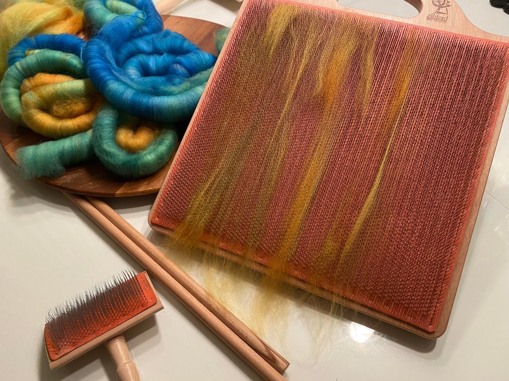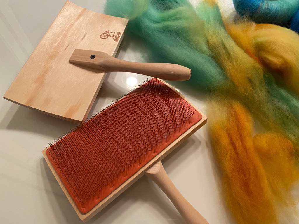 Pelkkä rukki olisi riittävä, jos hankin kehruuvalmista villaa, mutta sehän ei tietenkään tule kysymykseen, vaan haluan värjätä villani itse. Jotta voin käsitellä värjättyä villaa päädyin hankkimaan karstaimet. Karstamyllyt ovat kalliita, joten sen vedin listalta heti ylitse, mutta törmäsin sekoituslautaan ja päätin että siinä on hyvä ja huomattavasti karstamyllyä halvempii vaihtoehto villarullien valmistukseen.