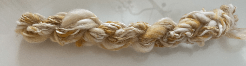 Ensituntuma oli pienoinen järkytys, sillä rukki tuntui kulkevan tuhatta ja sataa, polkeminen vei osan keskittymisestä ja kädetkään eivät tienneet mitä niiden kuuluu tehdä. Ensimmäiset 20 minuuttia oli lähinnä villan tuhoamista. Polkemisen lihasmuisti kehittyi aika äkkiä, joten siihen ei tarvinnut kiinnittää huomiota enää muutaman tunnin kuluttua. Ensimmäisen kokeilun tein villatopsilla. Syötin jatkuvasti liikaa kuitua kerrallaan ja kierrettä tuli todella epätasaisesti. Sain aikaiseksi hellyttävän monsterilangan. Säästän tämän vyyhdin, jotta voin palata näihin tunnelmiin myöhemminkin.