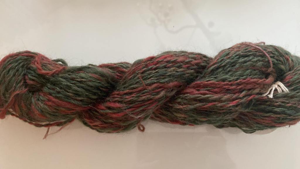 Rullalta kehrätty lanka on kuin onkin tasaisempaa. Toki paksuusvaihtelua on edelleen melkoisesti, mutta nyt lanka näyttää jo käyttökelposelta. Kehräsin kaksi rullaa punainen edellä ja kaksi vihreä edellä. Kun kertasin langan sain hauskaa värivaihtelua aikaiseksi. Toiseen rullaan jäi melkoisesti enemmän lankaa, joten kokeilin kertaamista ”lankarannekkeen avulla”, se oli melkoista sähellystä, kuten kertaaminen muutenkin.
