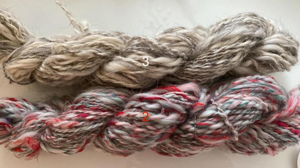 Kertaaminen tuntuu todella haastavalta. Lankaan tehdään rukilla vastapäivään kierrettä, alkuperäinen säie on kierretty myötäpäivään, joten kertaaminen tuntuu poistavan alkuperäistä kierrettä. Kertauskierteen jälkeen langan tulisi roikkua vapaasti U:n muotoisesti ilman, että se kiertyy itsensä ympäri. 2-vyyhdin kohdalla onnistuin tässä täydellisesti ihan vahingossa, mutta 3 ja 4 kiertyvät kevyesti itsensä ympäri.