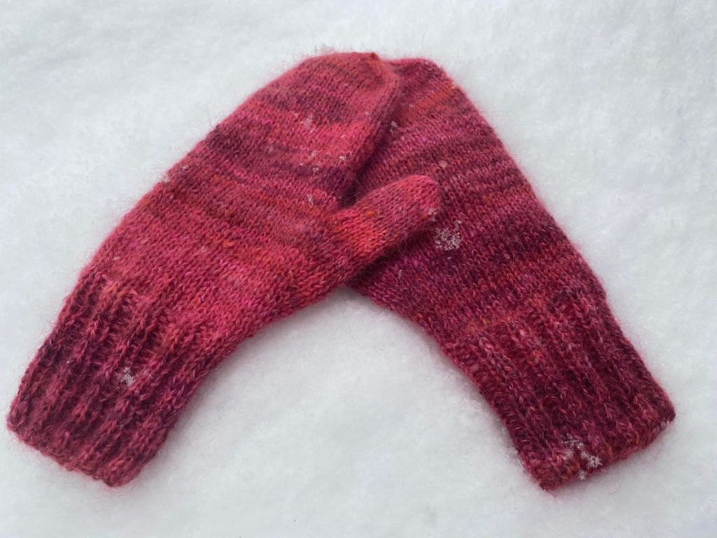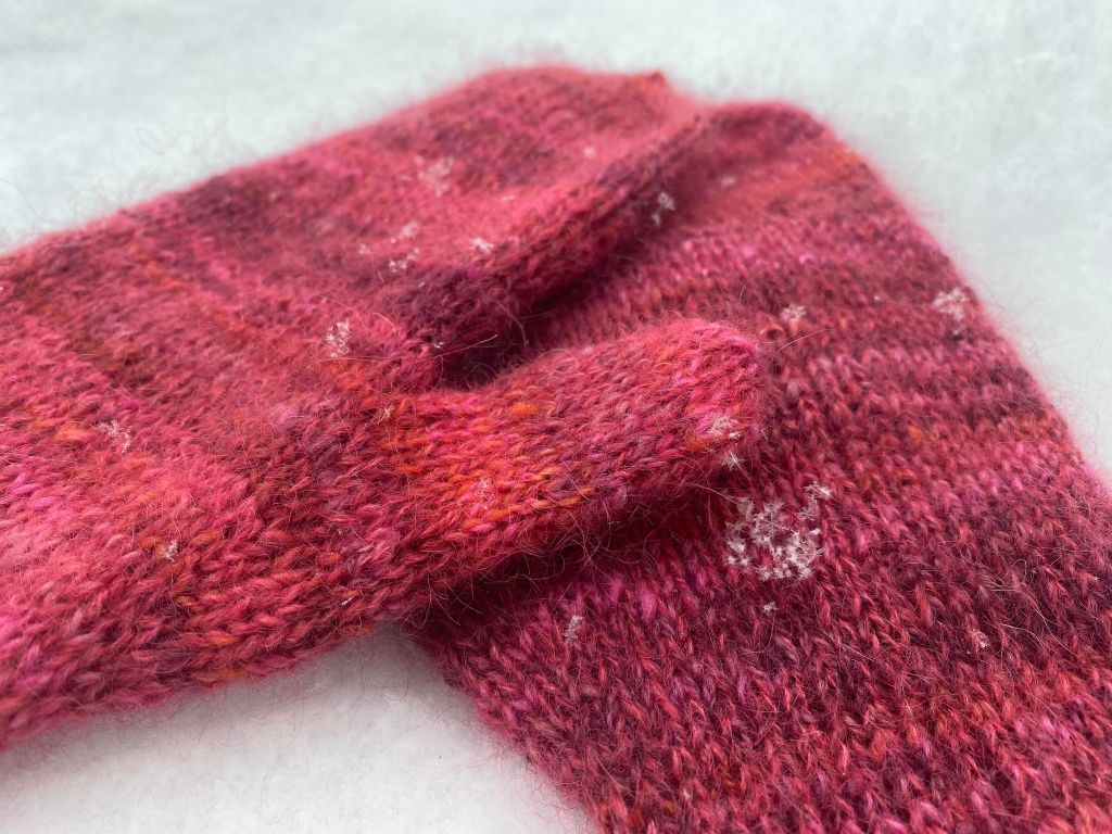 Päättele langanpäät. Kastele ja muotoile lapaset tarvittaessa.