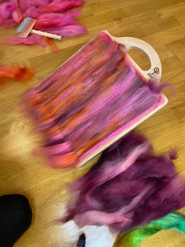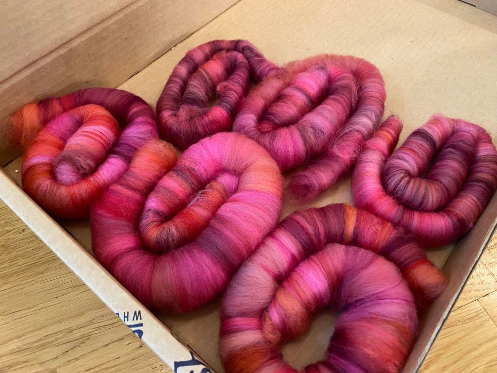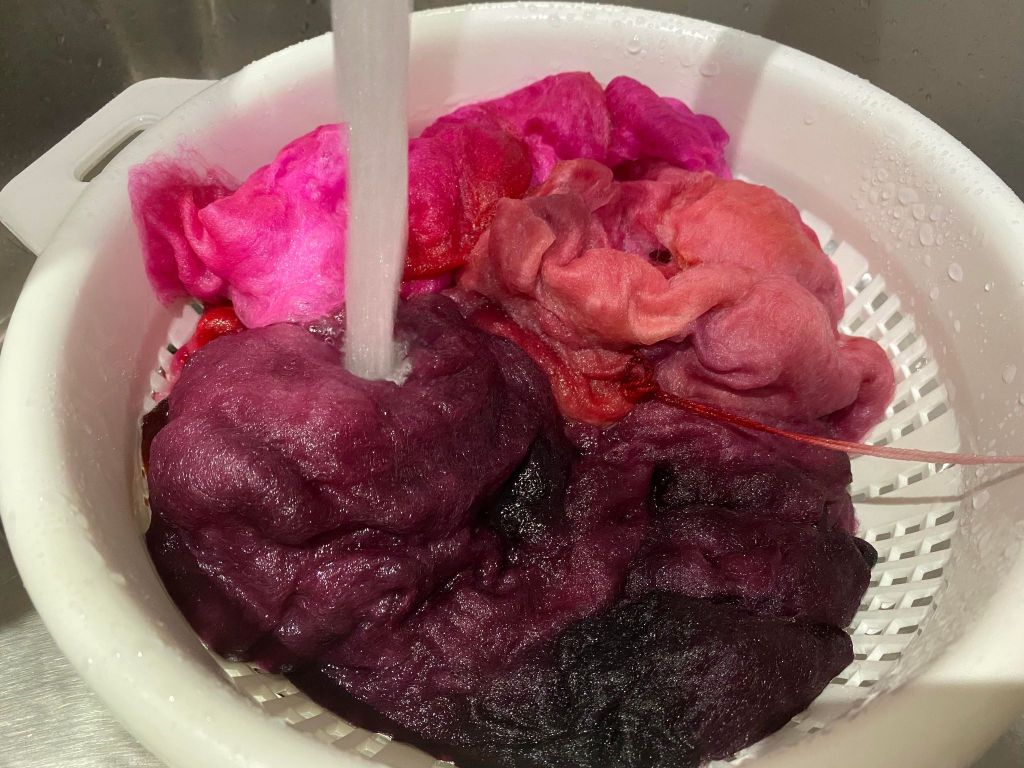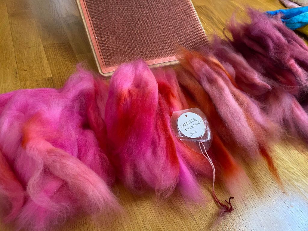 Prosessi alkoi tietenkin väripadasta. Värjäsin 100 g villatopsia punaisilla sävyillä. Falklandin villa ei tunnu vettyvän kovin hyvin, tai vesi ei jää siihen ”asumaan”, eli väriliemi sujahti villan lävitse pannun pohjalle. Koska väriseoksissa on eri väriaineita jotka sitoutuvat eri nopeudella, saattaa lopputulos olla hyvinkin kirjava. Yritin painella topsia litteäksi pohjaa vasten, mutta siitä ei ollut juurikaan apua, lähinnä aiheutti huopumista. Kuvasta näkee kuinka villaan jäi isoja ilmakuplia.
