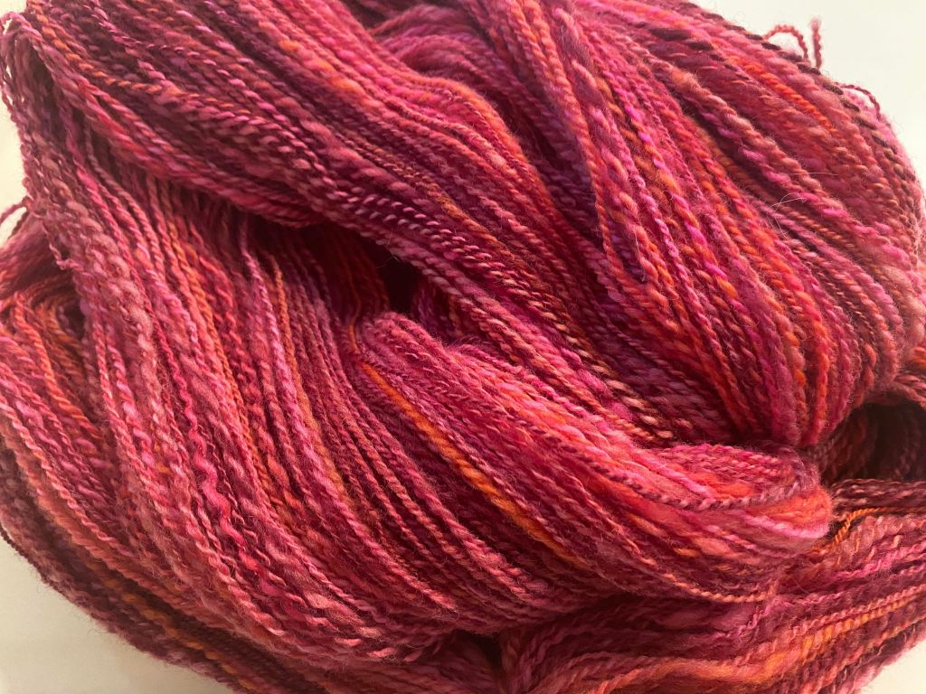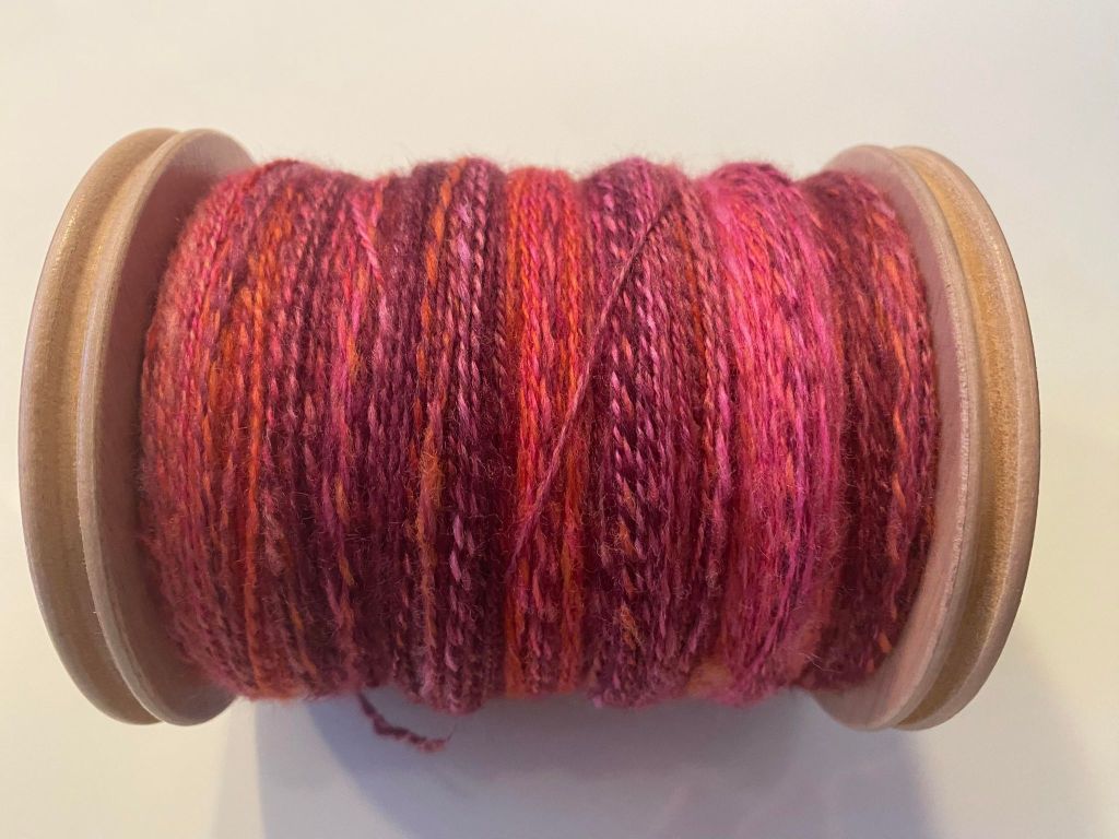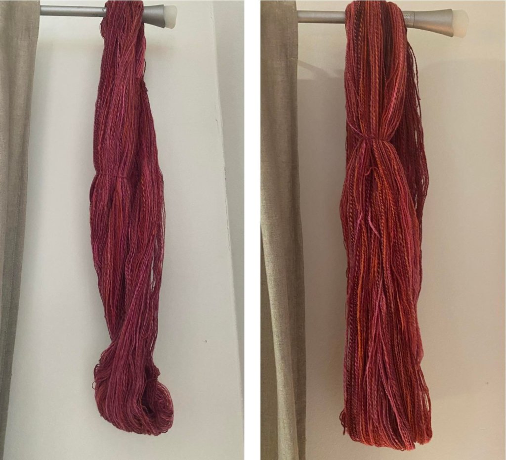 Valmis vyyhti roikkuu kastelun jälkeen kauniisti suorana, ennen kastelua vyyhti kiersi sopivasti myötäpäivään. Kuivatus on tehty ihan vapaasti roikkuen, eli ei mitään painoviritelmiä.