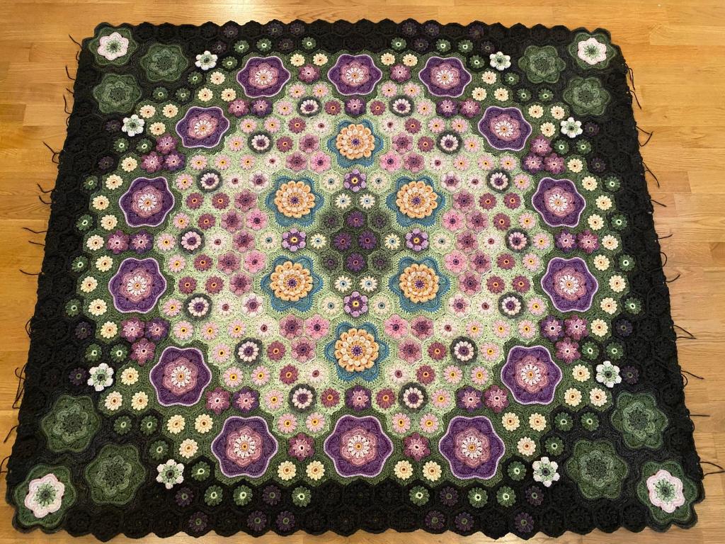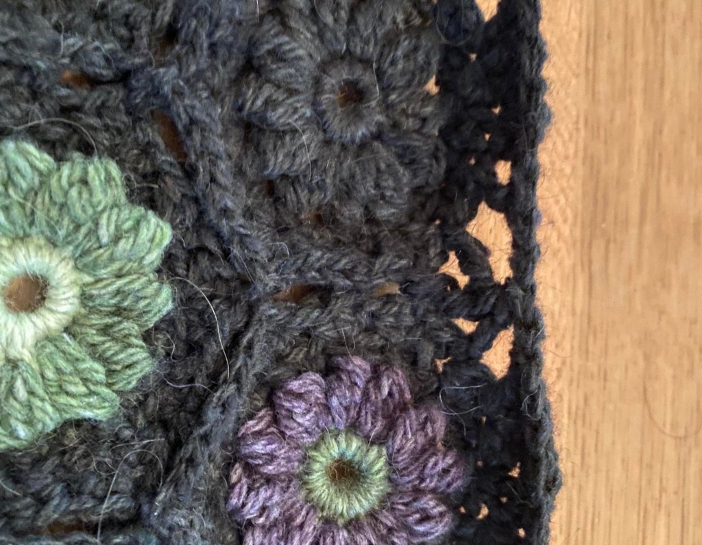 Halusin reunuksen kehystävän työn, joten sen jälkeen kun olin saanut työn tasaiseksi neliöksi, vaihdoin väriä. Minulla oli vaaleanpunaisia lankoja jäljellä sen verran, että ne riittäisivät juuri reunukseen. Kulmat olivat vähän hassun muotoiset, joten virkkailin niihin vähän täytettä miten sattuu, vasta peiton ollessa valmis, tajusin, että niihinkin olisi kuulunut tehdä puolikkaat kukat. Tummasta sotkusta tätä ei huomaa, joten päätin olla purkamatta kulmia. Eikä lankakaan olisi enää riittänyt korjaamiseen.