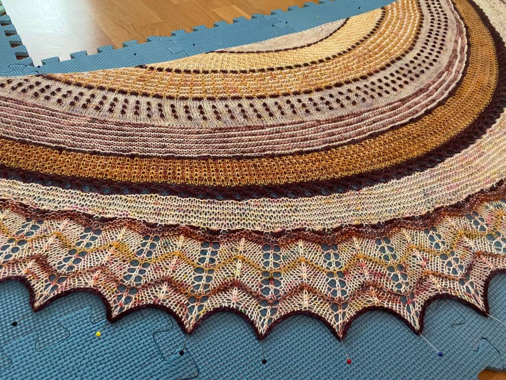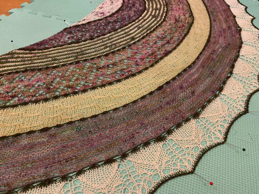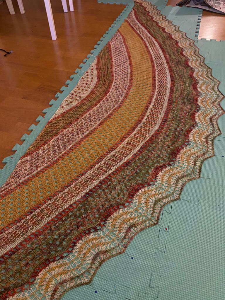 Pingotuksen jälkeen huivi näytti jo paljon paremmalta ja väritkin toimivat melko kivasti yhteen. Olisin kaivannut mintunvihreän tilalle jotain vähän raikkaampaa, mutta sellaista ei nyt ollut valikoimissa. Erityisen tyytyväinen olen siihen, että pysyin jämälangoissa. On paljon helpompaa korkata uusi sopiva lanka, kuin taistella jämien kanssa. Näihin huiveihin ei ole avattu yhtään uutta lankaa. Kaikkien huivien langat ovat fingerinpaksuista sukkalankaa, joista valtaosan olen värjännyt itse.