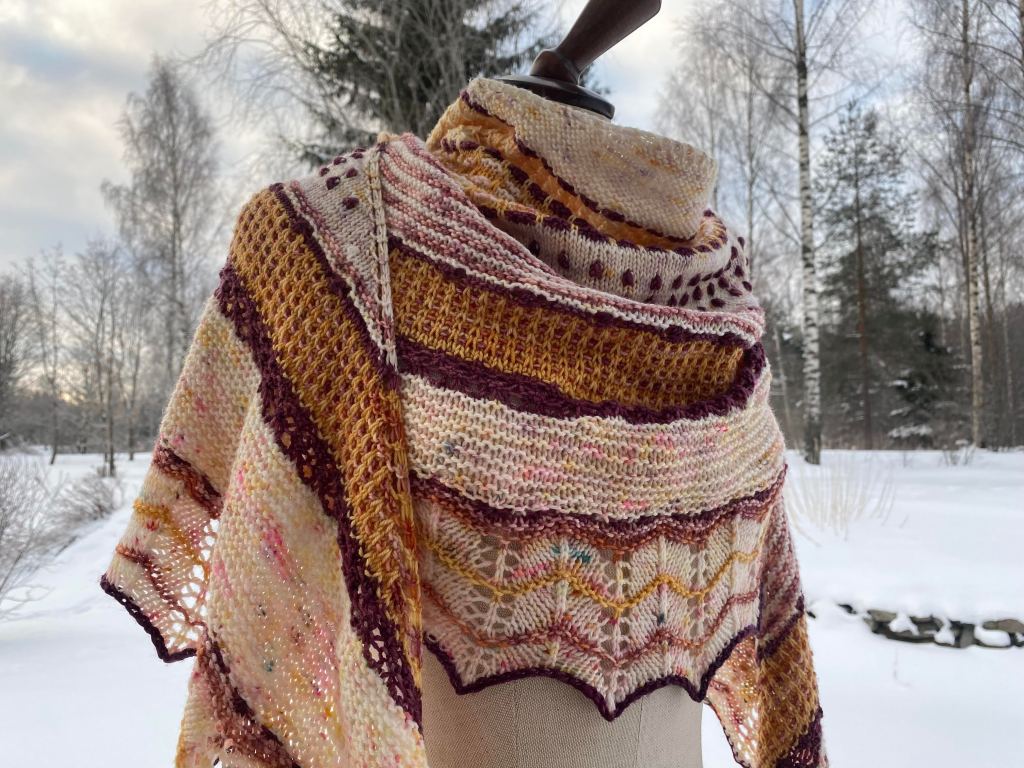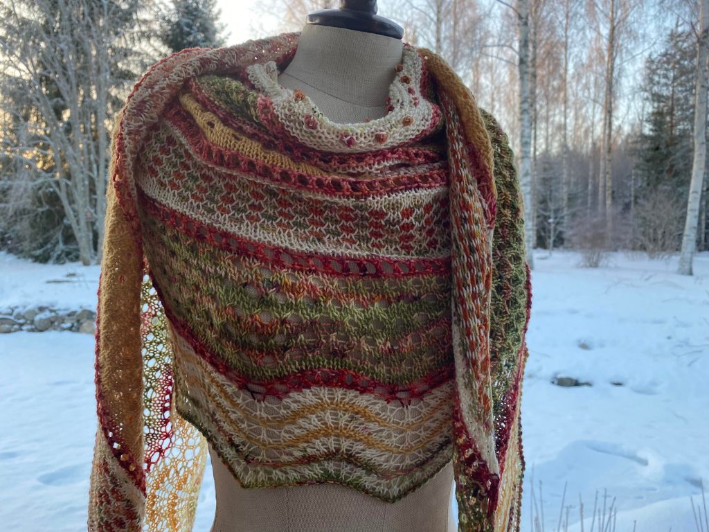 Huivi on vähän sinnepäin ohjeen mukaisesti, osaa kuvioista on muokkailtu ja muotoa todella paljon. Tähän huiviin sain upotettua 250 g lankaa.