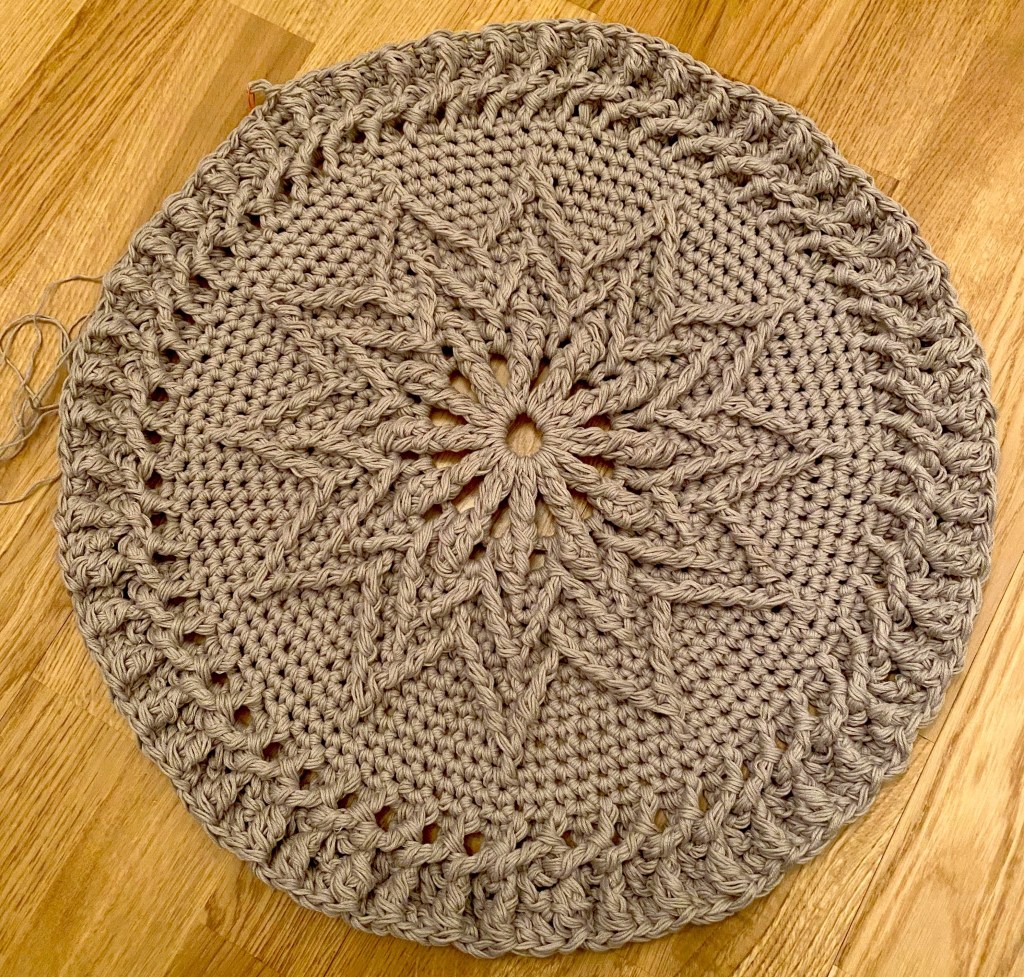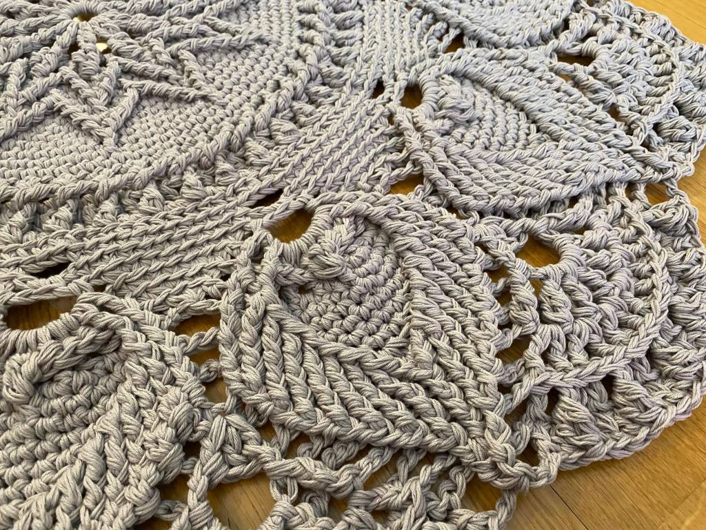 Matto poimuili välillä todella rajusti, mutta tilanne korjaantui aina myöhempien kerrosten myötä. En tehnyt yhtään sovellusta tai silmukkamäärien muutoksia, vaan matto on tehty aivan ohjeen mukaisesti. Reunaan muodostuu suuret lehdykät- Maton rakenne on hyvin kolmiulotteinen ja kerroksellinen.