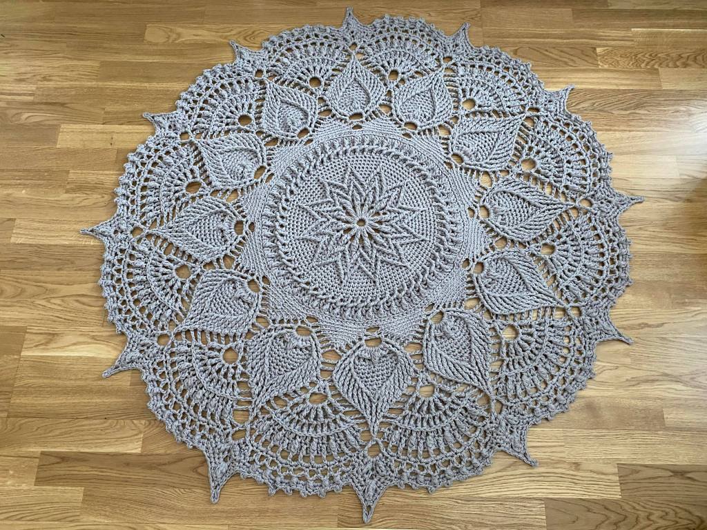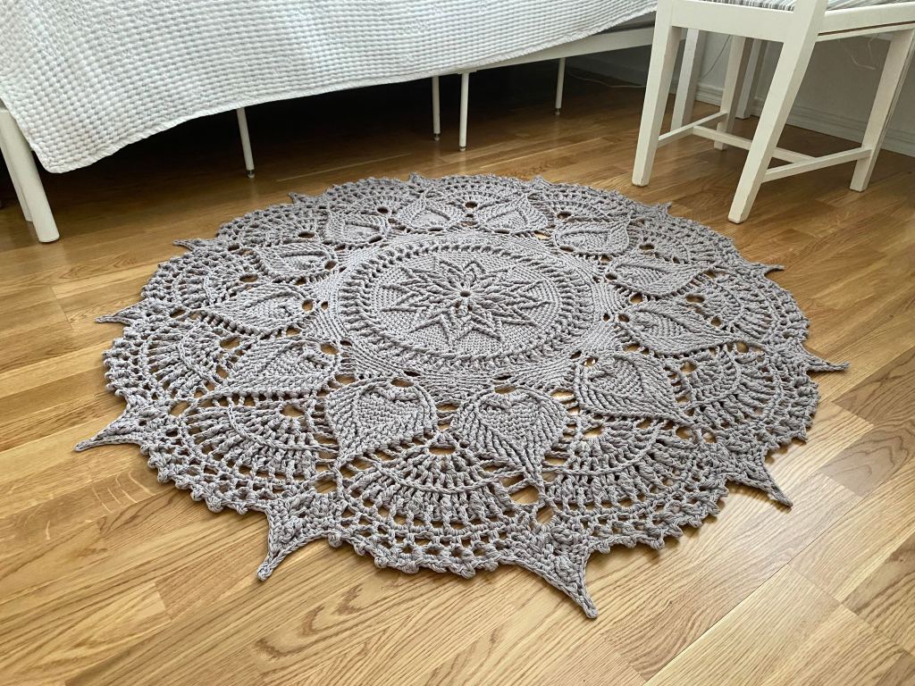 Tämä matto päätyi vierashuoneen lattialle. Valmiin maton halkaisija on noin 135 cm, mikä on juuri sopiva pieneen huoneeseen.