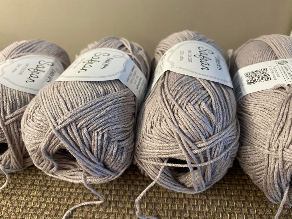 Ostin ohjeen mutta en ollut valmis sijoittamaan kuteeseen tai nyöriin montaa sataa, joten ostin harmaata Drops Safran lankaa alennuksesta 1,19 € / kerä. Lopulta lankaa kului vajaat 29 kerää, joten maton materiaalit maksoivat alle 35 euroa. Virkkasin lankaa nelinkertaisena 8 mm koukulla. Matosta tuli mukavan muhkea, mutta ehkä aavistuksen liian pehmeä. Lopputulos olisi varmasti ollut napakampi, jos langat olisi kiertänyt ensin yhteen.