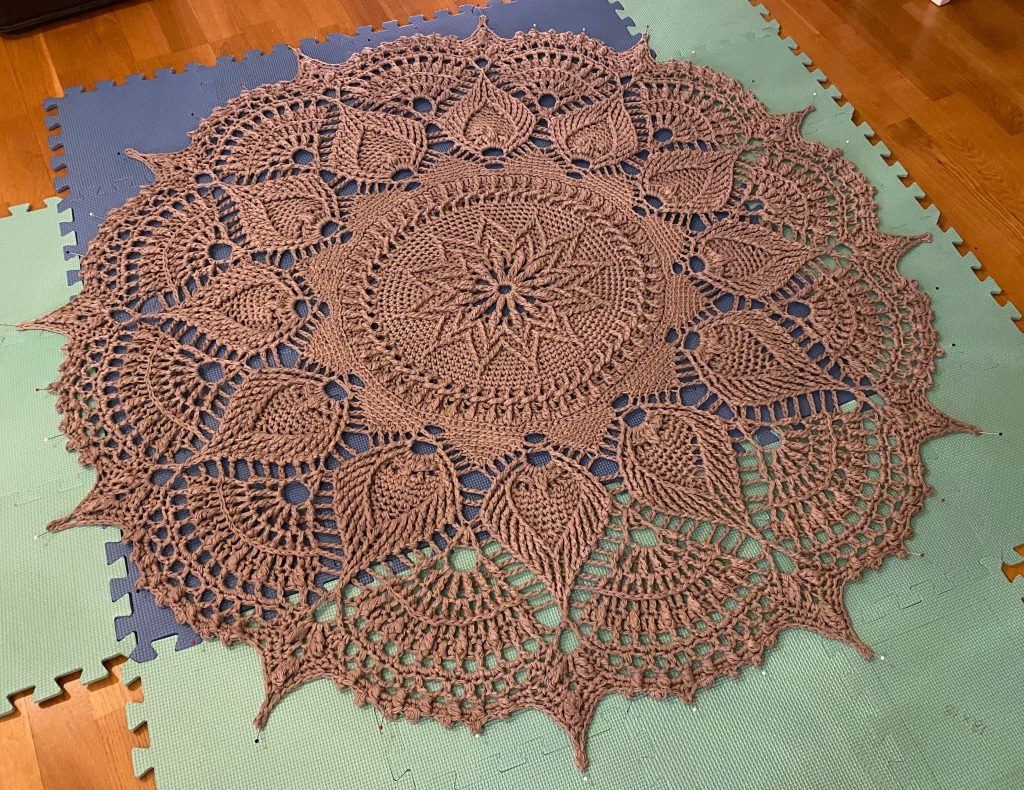 Kastelin valmiin maton läpmäräksi ja heitin sen koneeseen linkoukseen, jotta kuivuminen ei kestäisi ikuisuutta. Kastelu rentoutti kuviot hyvin ja viimeinenkin poimuilu katosi. Päädyin kuitenkin pingottamaan maton, jotta se olisi mahdollisimman ryhdikäs ja siisti. Lopulta ulkoreunaan ei juurikaan tarvinnut neuloja kovinkaan paljoa. Viuhkojen kohdalla on kaksi neulaa ja kärjissä yksi, ne riittivät hyvin pitämään maton muodossaan.