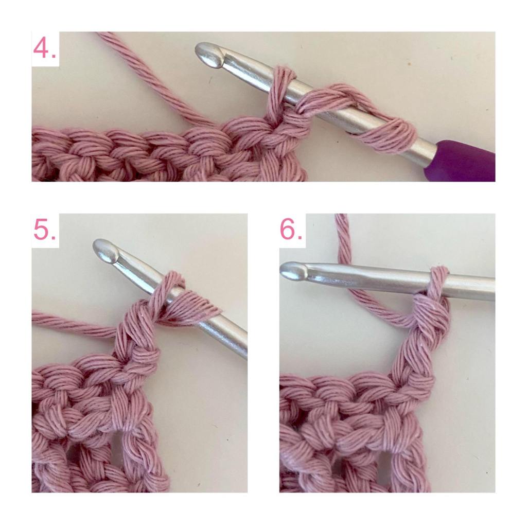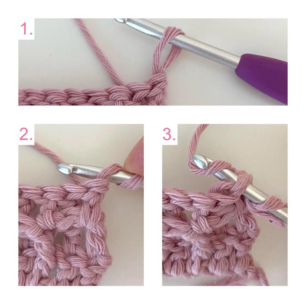 Seuraavat kerrokset voi aloittaa 3 kjs:lla tai aloituspylväällä oman maun mukaan. Mallipatalapussa kerros aloitettu niin, että silmukka on venytetty niin pitkäksi, että sen saa juuri kierrettyä koukun ympäri ja muodostettua pylvään siitä.