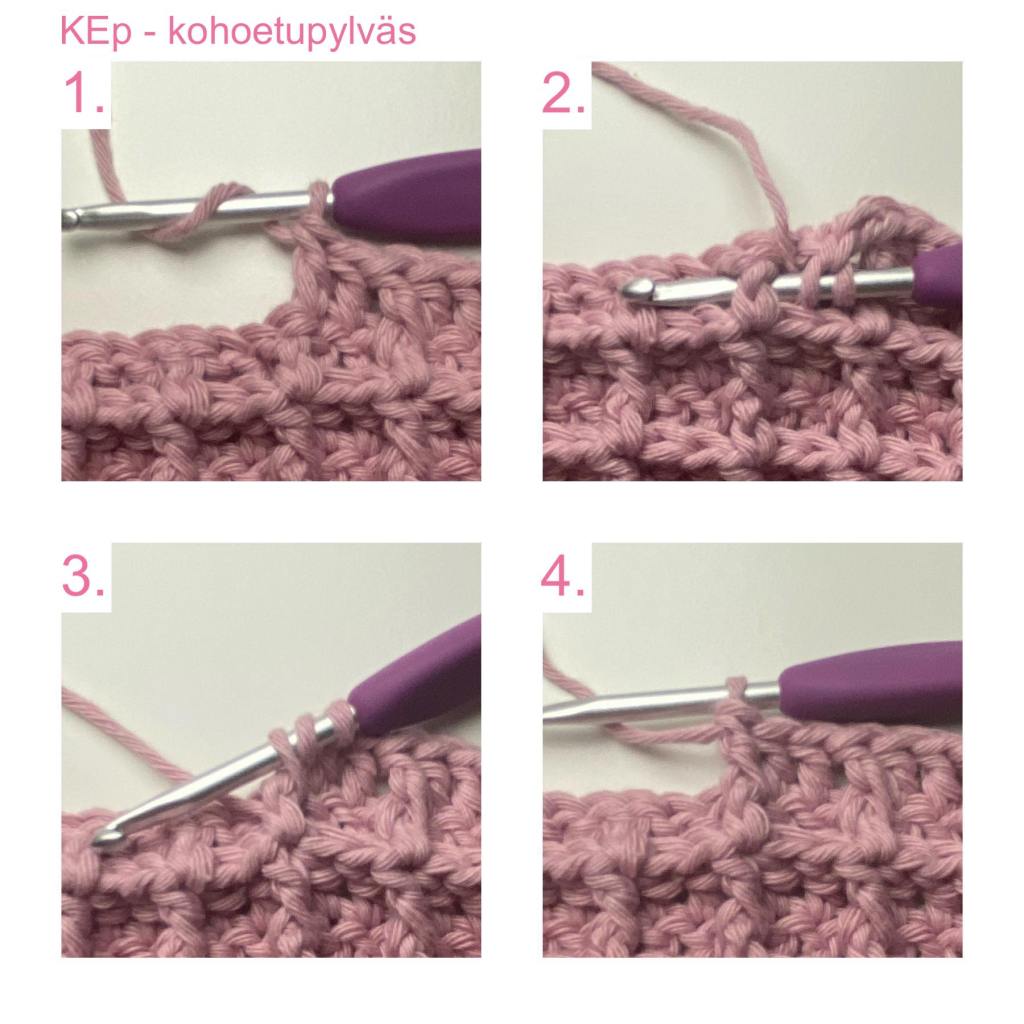 KE – kohoetu, koukku viedään seuraavan silmukan takaa oikealta vasemmalle takaisin työn eteen, muutoin silmukka tehdään kuten yleensä (pylväs tai kiinteä silmukka).